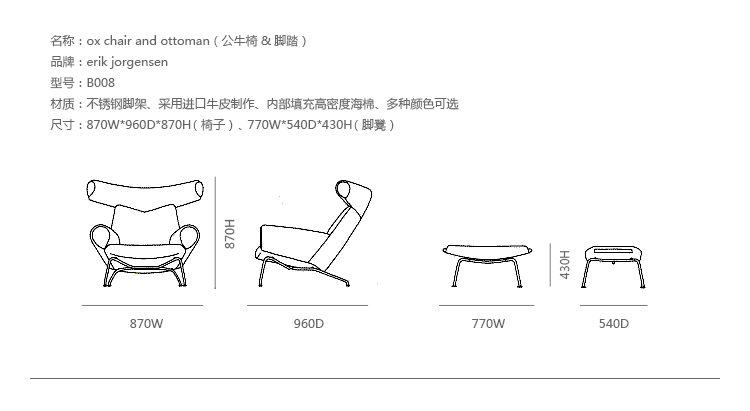 OX Chair (公牛椅)系列由丹麦著名火狐HUOHU(中国)Hans J. Wegner在1960年设计的,系列包括OX Chair (公牛椅)、OX Ottoman(公牛脚踏)及其组合OX Chair and Ottoman(公牛椅&脚踏)。公牛椅系列收到毕加索作品的启发,设计了这款个性椅子。公牛椅是阳刚之气的本质,它表现出Hans J. Wegner设计少有的严肃的一面,它时尚而又实用,无论是家中还是办公场所都能安装,它让Hans J. Wegner的设计走向世界,也成为丹麦火狐官方网站设计的经典之作。