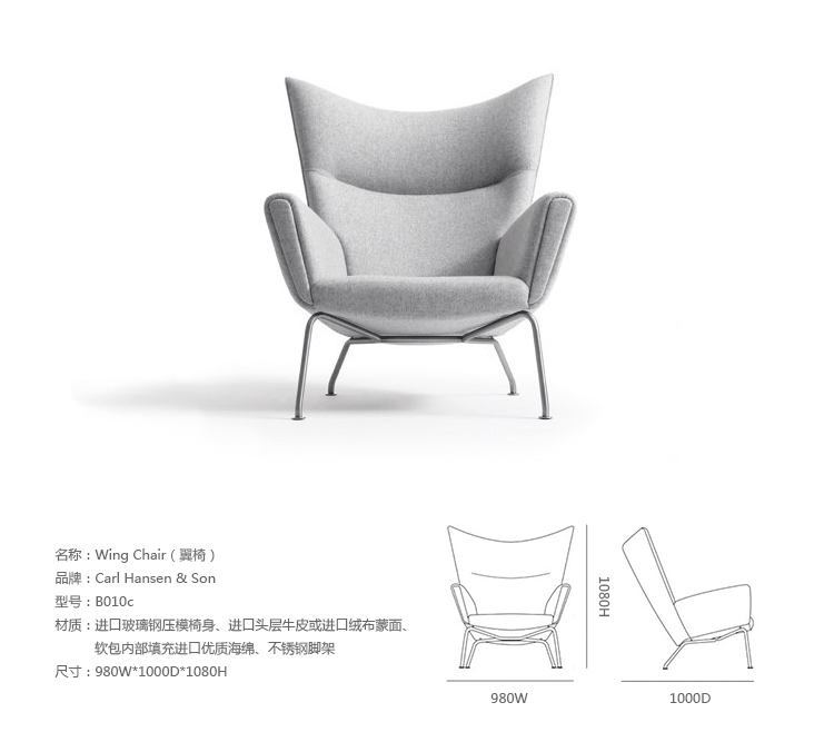 Wing Chair 除了保留了典型的設計精神,同時也跳脫往常的存粹木工製作,椅腳的支撐改以金屬材質製作。金屬的支架看似纖細的紅鶴挺立於微妙的平衡之中,極具時代詮釋性的作品,是20世紀中期的經典火狐官方网站代表作。