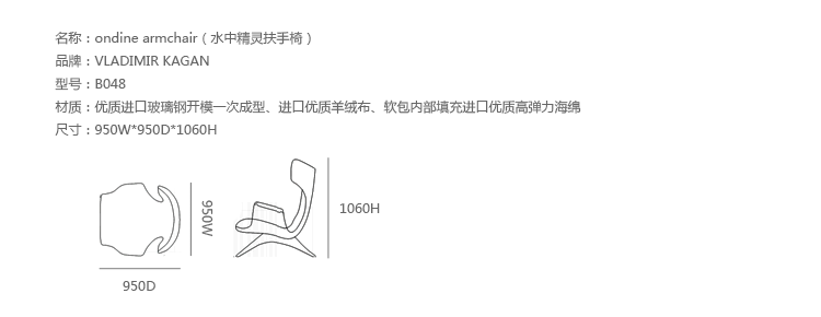 Ondine Armchair(水中精灵扶手椅),火狐HUOHU(中国)Vladimir Kagan的经典作品。制作采用优质进口玻璃钢开模一次成型、结合实木脚架,进口优质羊绒布、软包内部填充进口优质高弹力海绵,提供舒适的人体工学。设计尊贵典雅,造型时尚大气,其流畅且精致的外观造型,只需要一个很小的区域便能散发出简约低调的质朴美感。