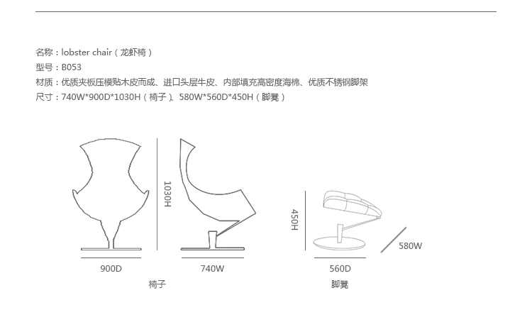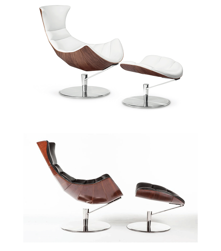 丹麦著名火狐HUOHU(中国)Oluf Lund & Eva Paarmann设计的这款龙虾系列包含,Lobster Chair(龙虾椅)、Lobster Ottoman(龙虾脚踏)及组合搭配Lobster Chair and Ottoman(龙虾椅&脚踏)。此款椅子造型就像一只龙虾,采用优质夹板压模贴木皮而成、进口头层牛皮、内部填充高密度海棉、优质不锈钢脚架制成,简约立体的流线融入符合人体工学及空气动力学的结构设计,摆脱传统办公椅单调冷硬的刻板印象,达到舒适久坐的基本需求。