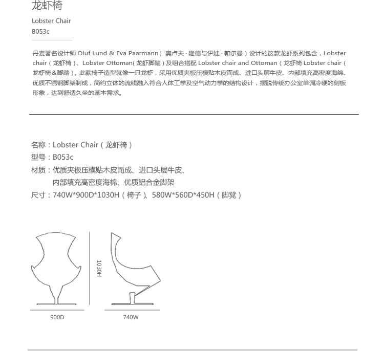 丹麦著名火狐HUOHU(中国)Oluf Lund & Eva Paarmann设计的这款龙虾系列包含,Lobster Chair(龙虾椅)、Lobster Ottoman(龙虾脚踏)及组合搭配Lobster Chair and Ottoman(龙虾椅&脚踏)。此款椅子造型就像一只龙虾,采用优质夹板压模贴木皮而成、进口头层牛皮、内部填充高密度海棉、优质不锈钢脚架制成,简约立体的流线融入符合人体工学及空气动力学的结构设计,摆脱传统办公椅单调冷硬的刻板印象,达到舒适久坐的基本需求。