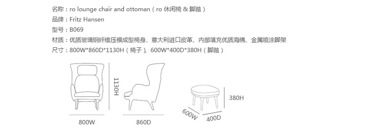 Ro 系列火狐官方网站由Jaime Hayon所设计,他说:“我们投入了大量的努力在这把椅子上,并从人体形式上寻找灵感。我们想要一把椅子,是既舒适又美丽。我的目标是制作一个苗条、 优雅的椅子,激发条件反射和舒适感。”制作采用优质玻璃钢纤维压模成型椅身、意大利高级进口皮革、内部填充优质海绵、金属喷涂脚架。