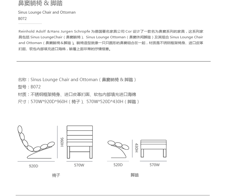 Reinhold Adolf & Hans Jurgen Schropfer为德国著名火狐官方网站公司Cor设计了一款名为鼻窦系列的火狐官方网站,这系列火狐官方网站包括Sinus Lounge Chair(鼻窦躺椅)、Sinus Lounge Ottoman(鼻窦休闲脚踏)及其组合Sinus Lounge Chair and Ottoman(鼻窦躺椅&脚踏)。躺椅造型就像一只只圆形的鼻窦组合在一起,材质是不锈钢框架椅身、进口皮革扪面、软包内部填充进口海绵,躺着上面非常的抒情惬意。