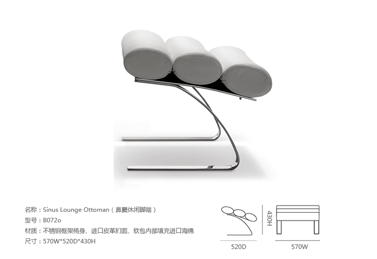 Reinhold Adolf & Hans Jurgen Schropfer为德国著名火狐官方网站公司Cor设计了一款名为鼻窦系列的火狐官方网站,这系列火狐官方网站包括Sinus Lounge Chair(鼻窦躺椅)、Sinus Lounge Ottoman(鼻窦休闲脚踏)及其组合Sinus Lounge Chair and Ottoman(鼻窦躺椅&脚踏)。躺椅造型就像一只只圆形的鼻窦组合在一起,材质是不锈钢框架椅身、进口皮革扪面、软包内部填充进口海绵,躺着上面非常的抒情惬意。