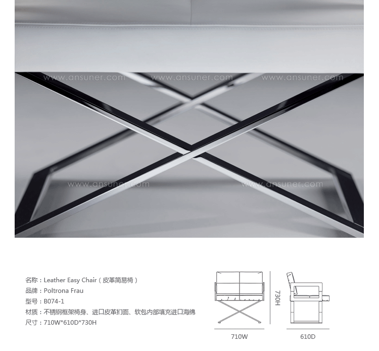"Leather皮革椅系列火狐官方网站线条干净简明,“X”交叉造型或者“H”造型脚架支撑着坐垫,新颖独特,由Jean-Marie Massaud设计。它采用外露的金属架,有三种不同的做工,座椅为聚氨酯泡沫材料,靠背较低,坐垫宽敞。有两种面料可供选择:天然皮革和纺织面料。两种款式都有皮革和染色纺织面料的扶手和同款的靠枕。沙发椅的造型形式严谨,它的特点和个性特征与Poltrona Frau现代室内家居的设计非常统一协调。