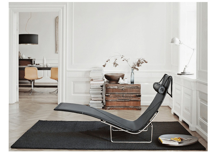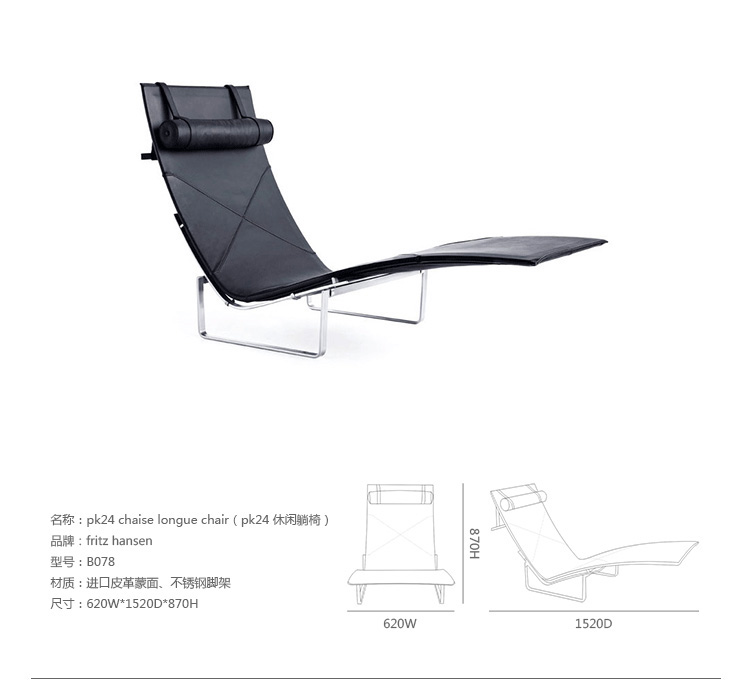 PK24 Chaise Longue Chair(PK24休闲躺椅)是著名的火狐HUOHU(中国) Poul Kjaerholm设计的经典作品,是Fritz Hansen公司的“Poul Kjaerholm系列”之一。 PK24躺椅(PK24 lounge chair) 是一款经典设计,功能结构的底座结合优美悬浮的座位,椅子的主要部分没有物理上的连接,但并没破坏整体设计的平衡和稳固性。覆盖牛皮的座垫包装了舒适的躺椅特征。带有曲线的不锈钢架为座垫提供了稳固的支撑,同时带来艺术美感。