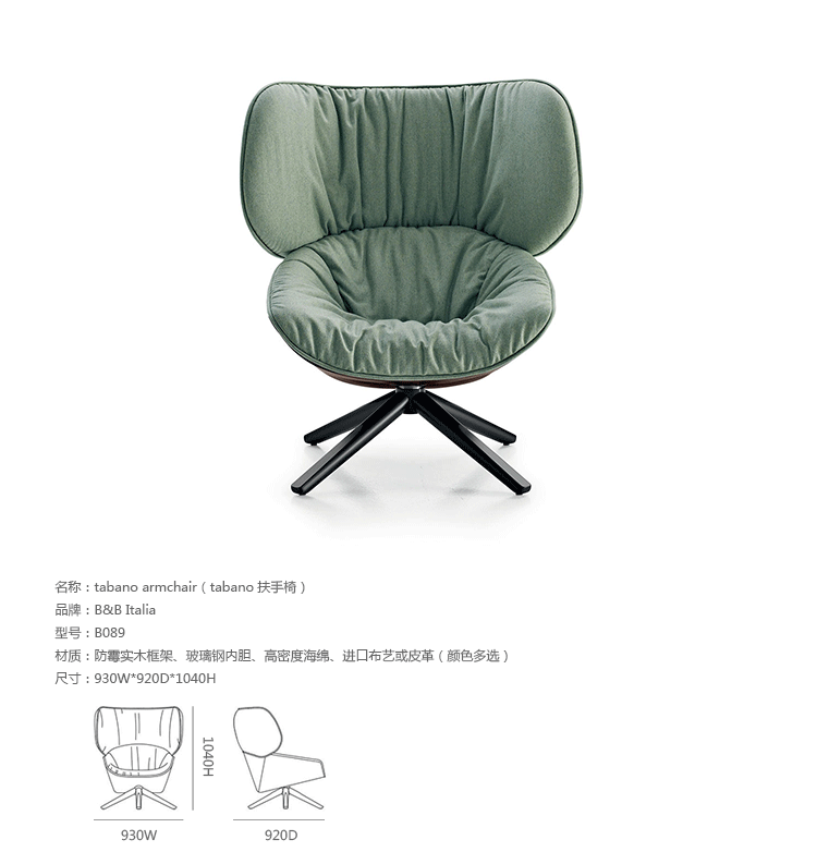 现在可以很明显的看到,追求柔软舒适,一向是Patricia Urquiola的作品中不变的主题。旋转扶手椅Tabano代表着一个重要的阶段,由Husk首次体现这个宣言,其共同特徵是椅背皆插入大型幅条。这也可以说是追求舒适,定义出它的曲线与大容量的椅座与椅背。 大耳朵般的设计来自于满足功能标準上的需求,更甚,这是一种超越美感经验的慰藉。它的外观唤起好奇心,极富表现力,一点都不保守。 对卡通视而不见的揶揄,它同时向大师传承下来的作品,与对先前建立起难以超越的躺椅表示敬意。饰面分别表现出紧緻的外表和轻鬆的内侧。内外侧皆被Tabano完整定义,加入了拉鍊和人造皮革绕起整座外围, 具张力的饰面投射出对比的乐趣。Tabano在黑色聚氨酯旋转底座或橡木(浅、灰色和黑色)有布料或全皮外观,或这两种材料的组合, 脚凳更有椭圆形和其类似座椅的衬里。