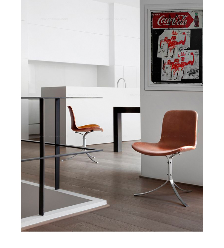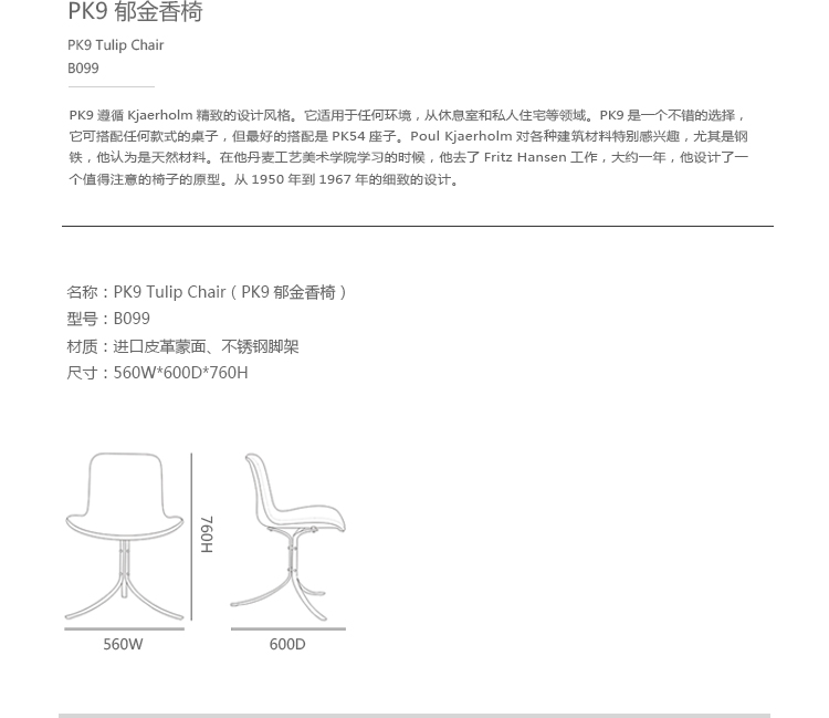 PK9——也称为“郁金香椅”是Fritz Hansen公司的“Poul Kjaerholm系列”之一。 简单而著名,PK9遵循Kjaerholm精致的设计风格。它适用于任何环境,从休息室和私人住宅等领域。PK9是一个不错的选择,它可搭配任何款式的桌子,但最好的搭配是PK54座子。Poul Kjaerholm对各种建筑材料特别感兴趣,尤其是钢铁,他认为是天然材料。在他丹麦工艺美术学院学习的时候,他去了Fritz Hansen工作,大约一年,他设计了一个值得注意的椅子的原型。1955年,Kjærholm开始与制造商Ejvind Kold Christensen合作,这一直持续到1980年去世。1982年,Fritz Hansen接管了生产和销售“Kjærholm系列”:从1951年到1967年的细致的设计。PK9郁金香椅有一个三脚架,拉丝不锈钢基础,皮革坐垫可供您选择。