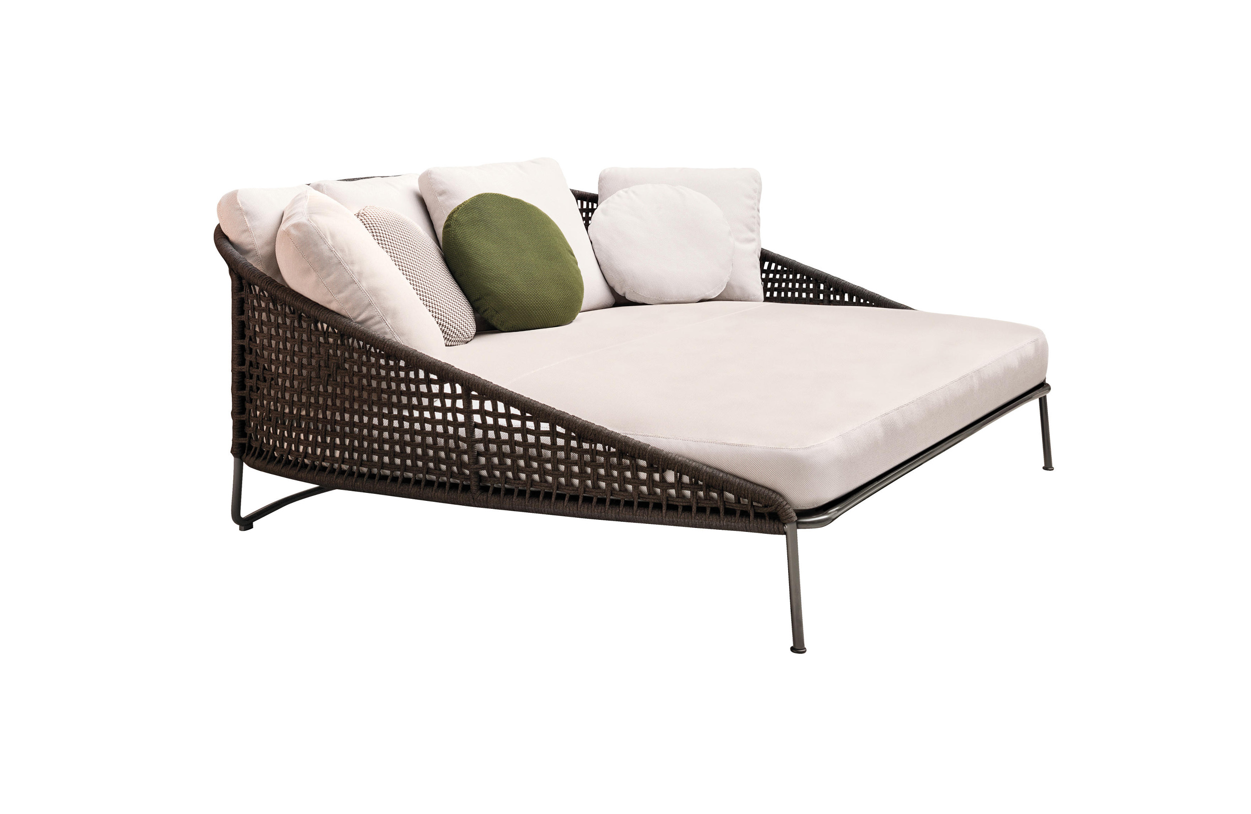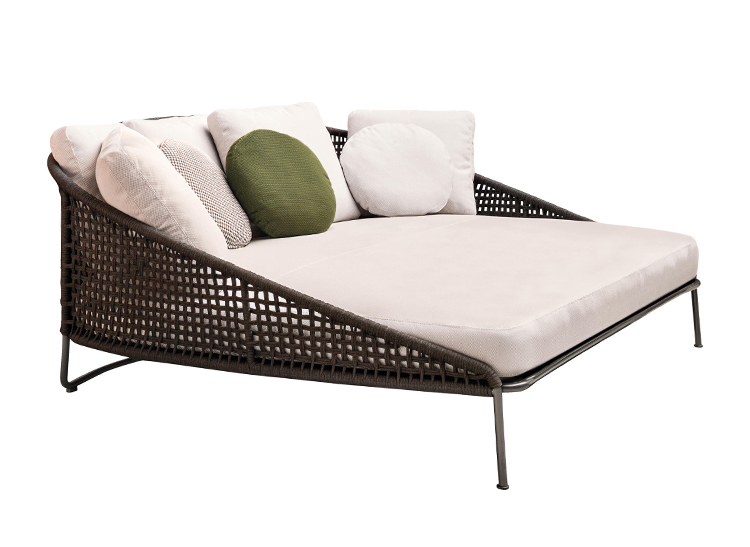 Aston是一个单品家族系列,其中包括沙发、沙发床、扶手椅、脚凳、座椅,为家居环境和“共享空间”提供优雅而时尚的装饰,在室内和室外皆可应对自如。阿斯顿“绳”户外系列采用金属材质的构架,搭配Pewter色聚酯漆面,部件都针对户外环境而经过特别处理,覆面采用疏水性纤维面料。靠背采用直径为7毫米的特殊聚丙烯纱线编织而成,两种颜色可供选择:浅灰色和深棕色,与全新Art Lifescape 02系列的面料和Alison “Dark Brown”户外系列的色调相得益彰。针对户外环境的特点,金属构架经过特别处理,搭配Pewter色聚酯漆面,覆面采用特殊聚丙烯纱线编织而成,有两种颜色可供选择:浅灰色和深棕色。坐垫采用Minotti Studio独家设计并通过激光加工而成的几何装饰。靠垫的内部填充物是高弹性聚氨酯泡沫,覆面采用疏水性纤维面料。
