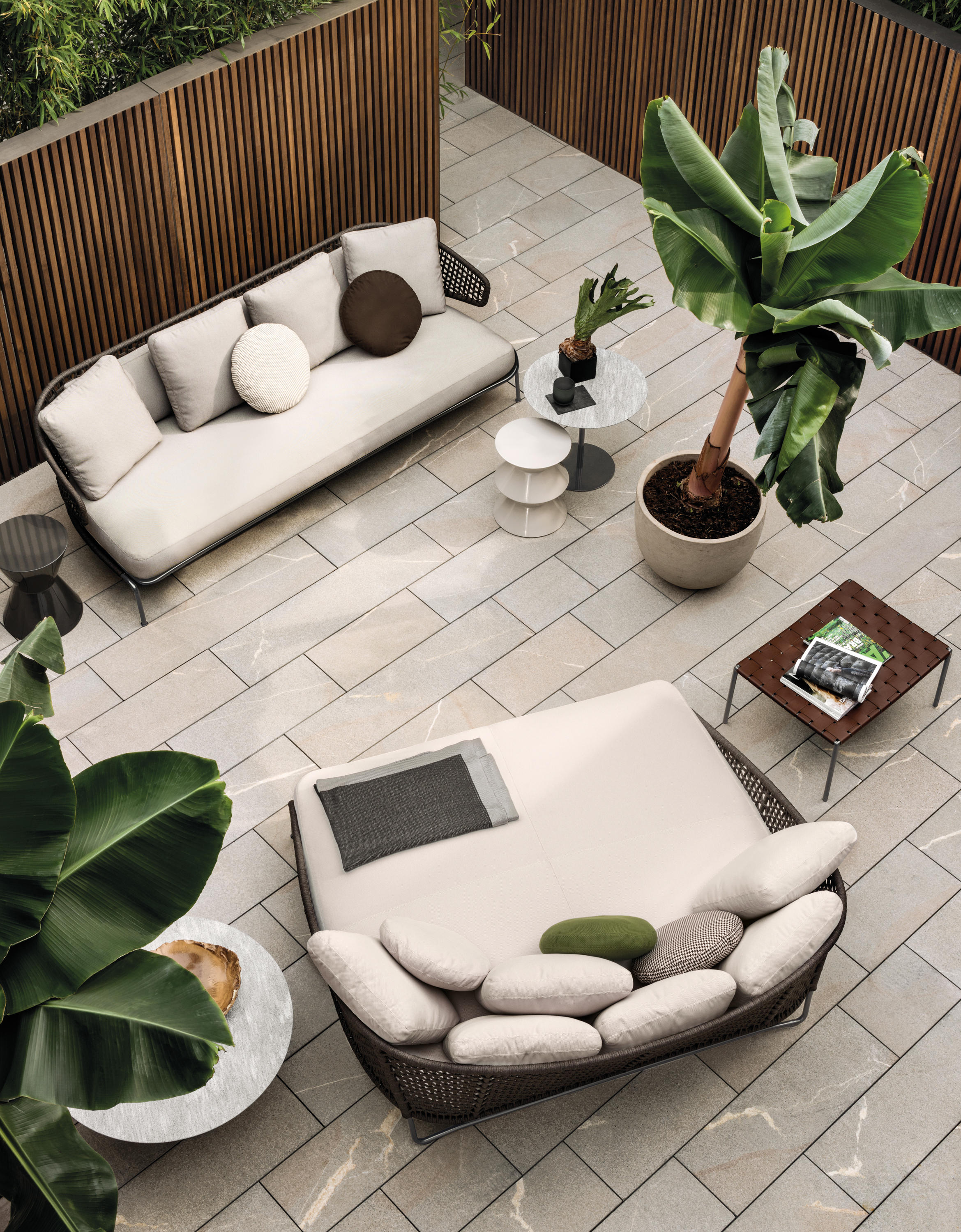 Aston是一个单品家族系列,其中包括沙发、沙发床、扶手椅、脚凳、座椅,为家居环境和“共享空间”提供优雅而时尚的装饰,在室内和室外皆可应对自如。阿斯顿“绳”户外系列采用金属材质的构架,搭配Pewter色聚酯漆面,部件都针对户外环境而经过特别处理,覆面采用疏水性纤维面料。靠背采用直径为7毫米的特殊聚丙烯纱线编织而成,两种颜色可供选择:浅灰色和深棕色,与全新Art Lifescape 02系列的面料和Alison “Dark Brown”户外系列的色调相得益彰。针对户外环境的特点,金属构架经过特别处理,搭配Pewter色聚酯漆面,覆面采用特殊聚丙烯纱线编织而成,有两种颜色可供选择:浅灰色和深棕色。坐垫采用Minotti Studio独家设计并通过激光加工而成的几何装饰。靠垫的内部填充物是高弹性聚氨酯泡沫,覆面采用疏水性纤维面料。
