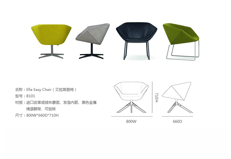 Ella Easy Chair(艾拉简易椅)由著名火狐HUOHU(中国)Niels Bendtsen设计的。这把椅子是一个紧凑的座位让你采取的所有礼仪坐姿轻松而获得适当支持.一个显著的特点是它的扣盘形状,连同它的几何面两侧扶手椅给一个真正独特的外观.阀座完全由聚氨酯泡沫成型,具有特别高的耐久性.此款为三趾脚架,采用进口皮革或绒布蒙面、发泡内胆、可自由旋转。