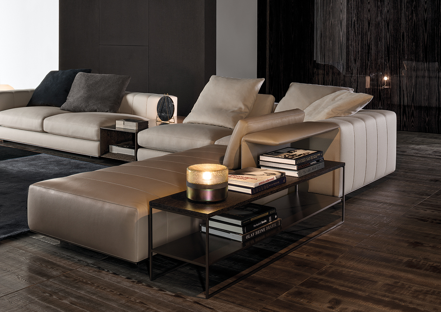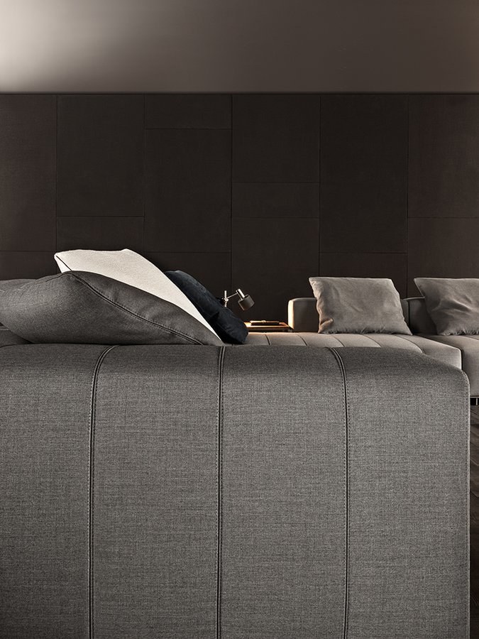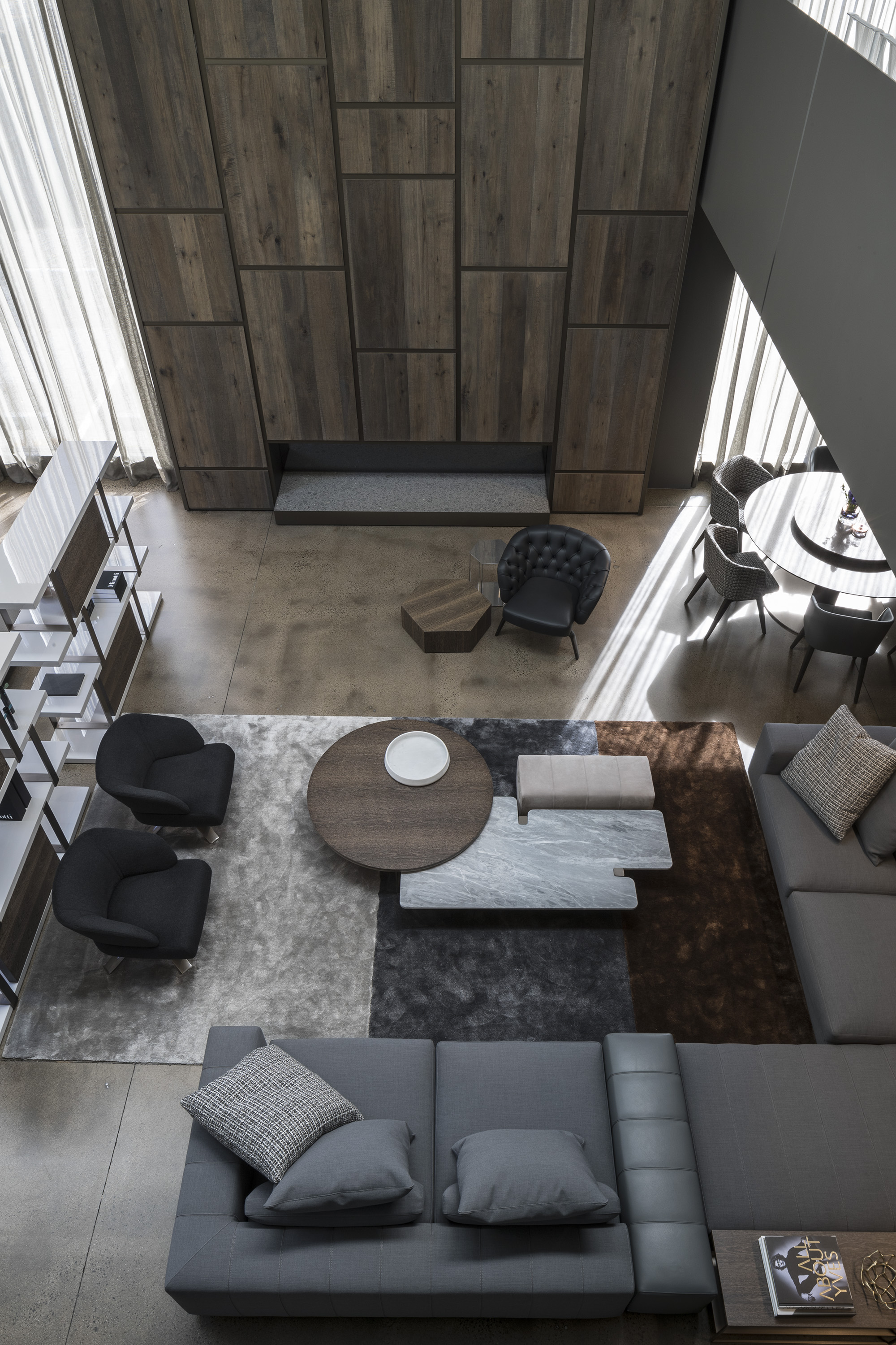 弗里曼“裁缝”项目的理念和原创性在其衍生系列弗里曼“休息室”中也有所体现。弗里曼“休息室”沙发纵深度有所降低,不仅更易搭配较小的居住空间,还可以用在接待场所,如等候室、前台区域、行政办公室。单组沙发的特点在于采用规则图形纹样的优雅缝线设计,可以自由随性地组合沙发,打造灵动的造型。“Wing”扶手拥有轻盈的线条,这要得益于采用聚氨酯为基材的泡沫金属框架。精致的包覆材料展现出公司运用复杂面料进行剪裁加工的实力。皮革和织物面料的各个部件通过浅铜色人造皮革束带和双缝线工艺连接在一起,打造出独特的纵深效果。
