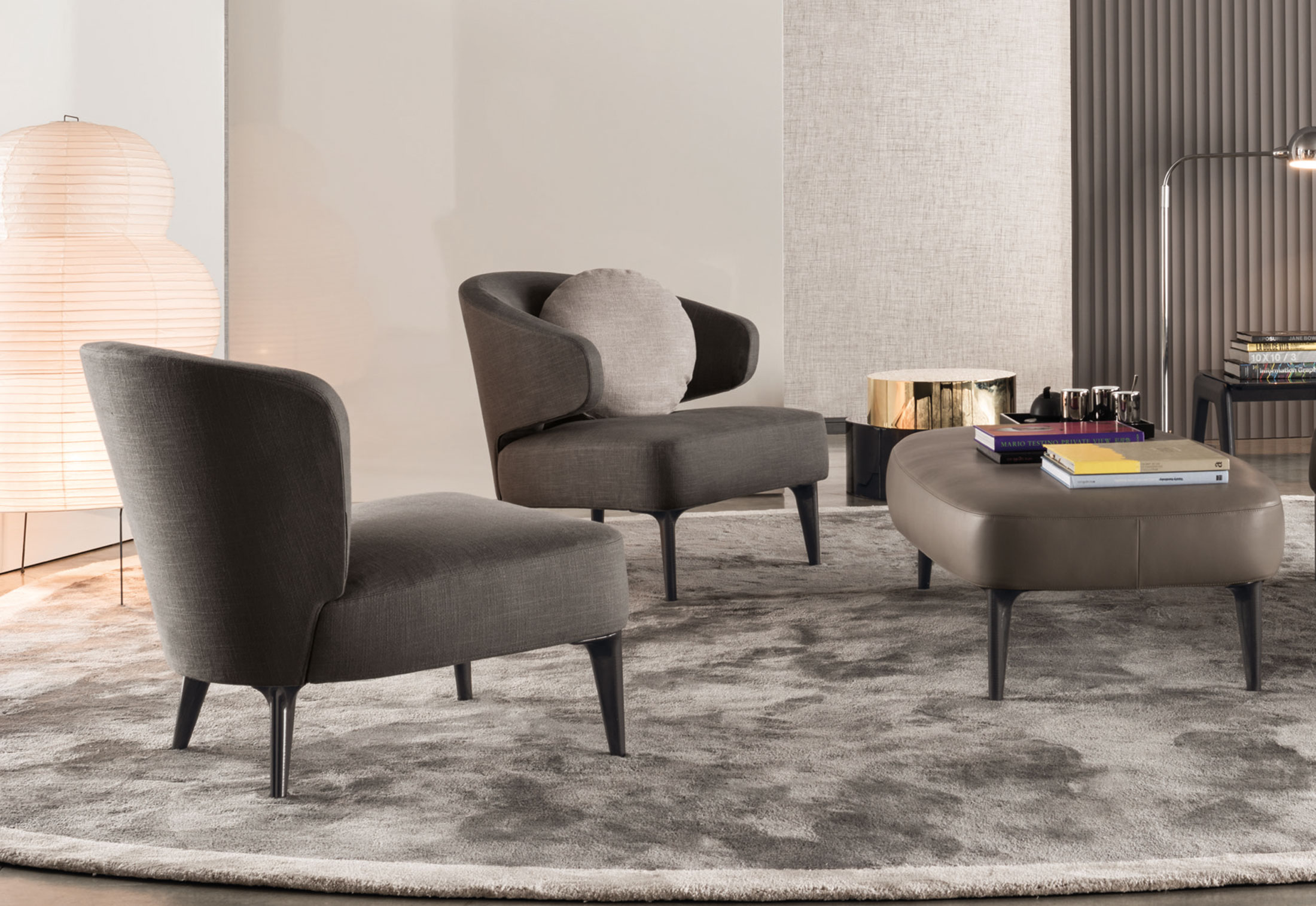 重叠的造型搭配珍贵的材质,这就是Benson的独特之处。木材的质感和金属的光亮感完美展现出雕塑般的造型。Benson边几可以直接放置在地面上,有两种不同的尺寸可供选择,以满足不同的功能需求。尺寸为120x95厘米的版本,基座为椭圆形,上方面板为圆形,配备的机械装置可以使其旋转360度,增强边几的延展性,使其更加靠近沙发座椅。直径为46厘米,高度为38厘米的版本,专门用于放置在沙发和扶手椅的侧方,有以下组合可供选择:一种是下方台面为亮面乌木,上方台面为亚光铜色板材;另一种是下方台面为Moka色亮光漆,上方台面为金色亮光漆。