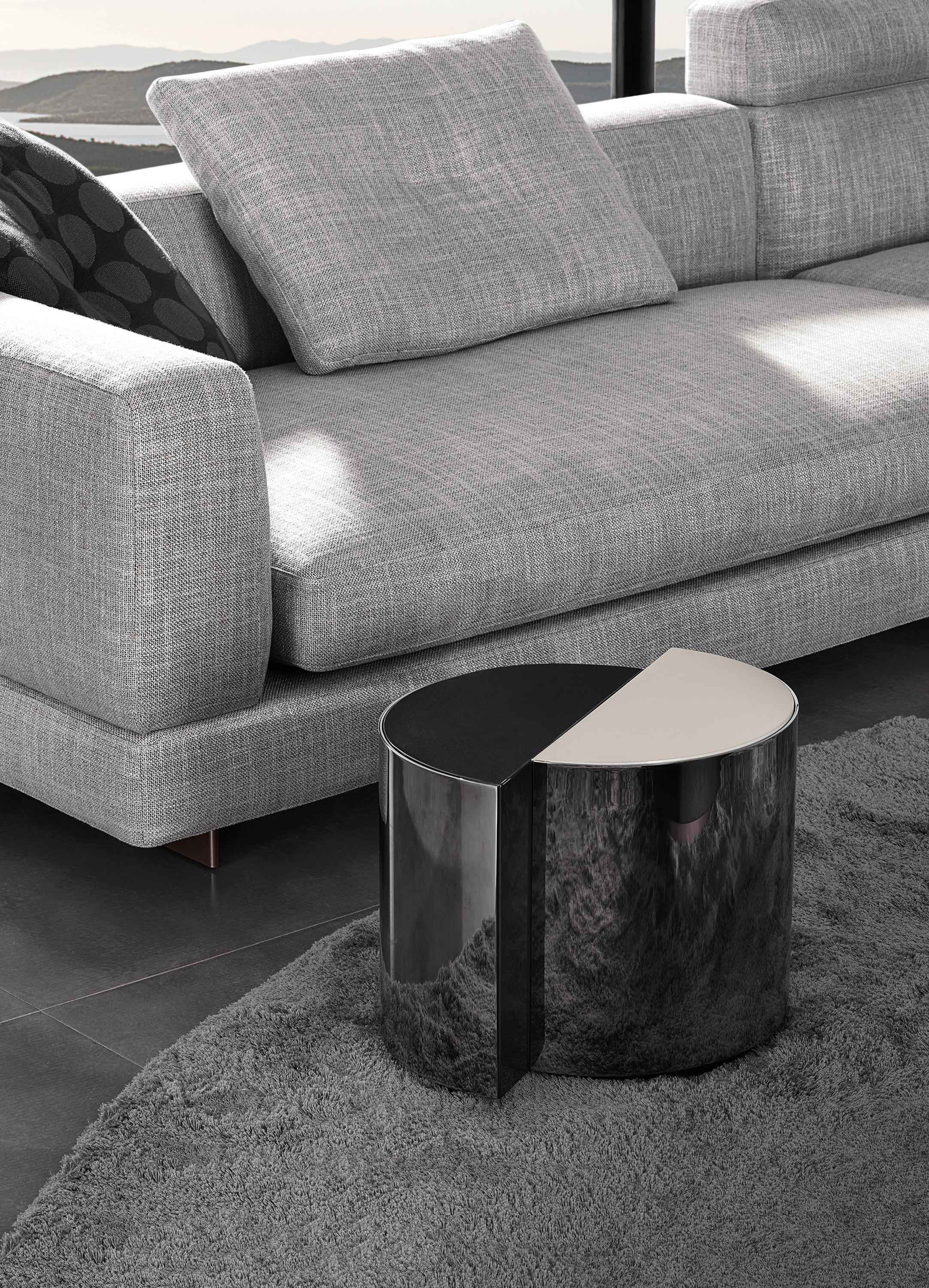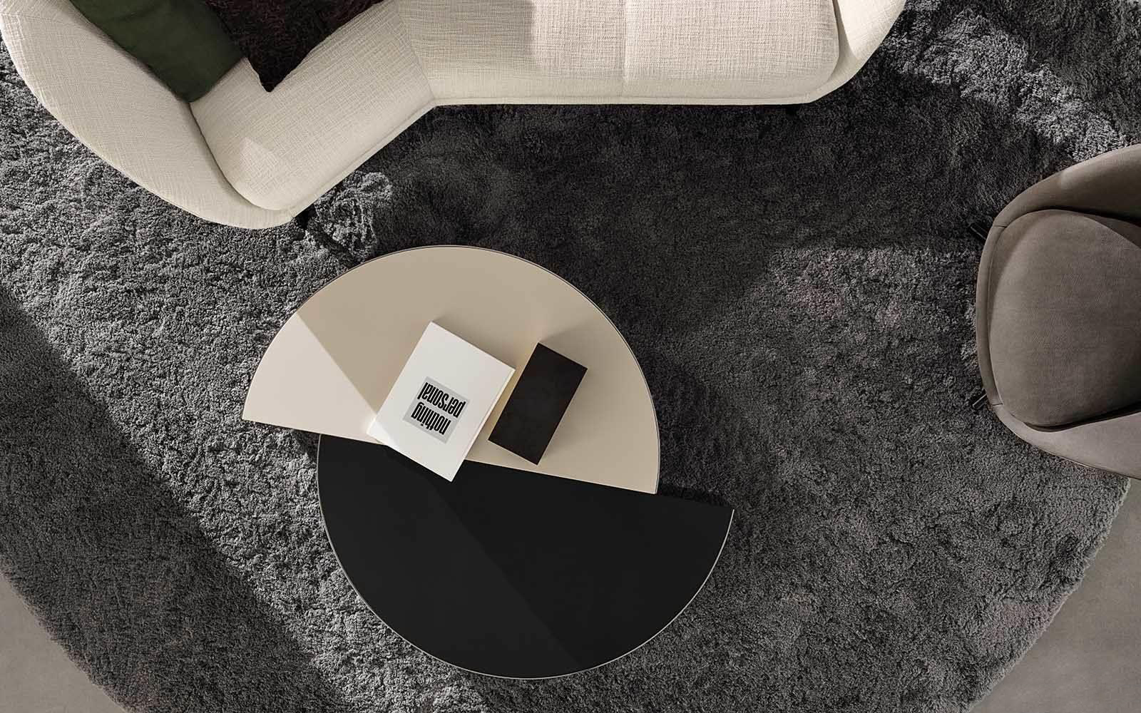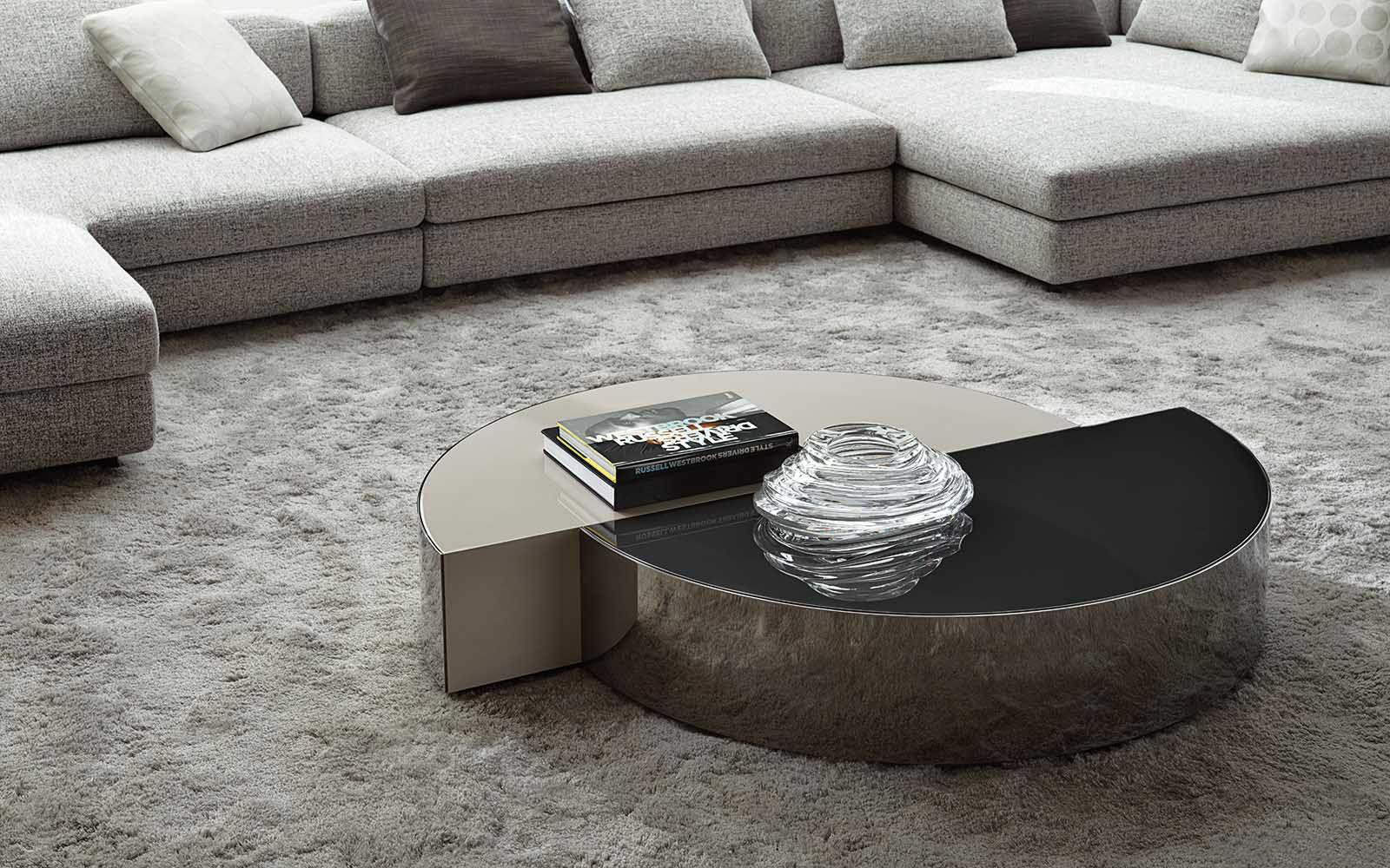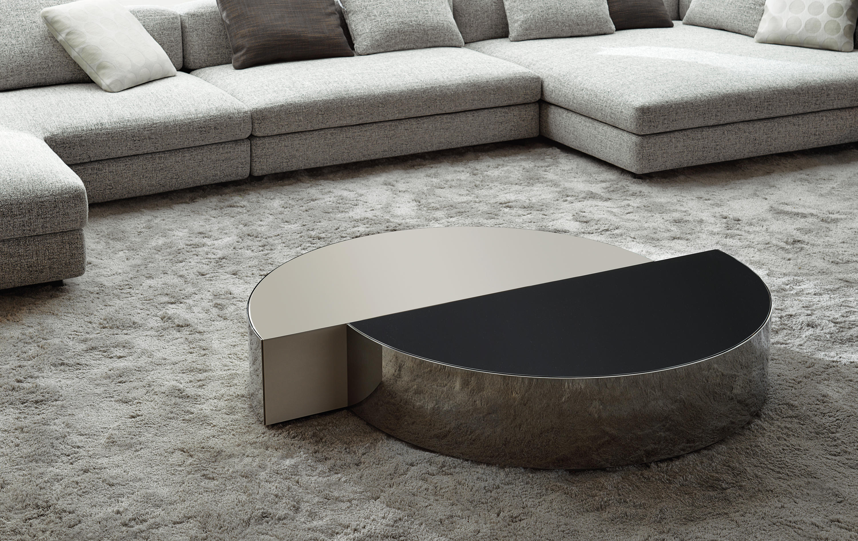 盾牌桌子上有一个强烈的雕塑印记,让人想起70年代的当代雕塑。它被设计成一个几何体积,圆柱体的形状被分成两个偏置的部分,并用一个带有黑色镍涂层的弧形钢板的屏蔽来补充。