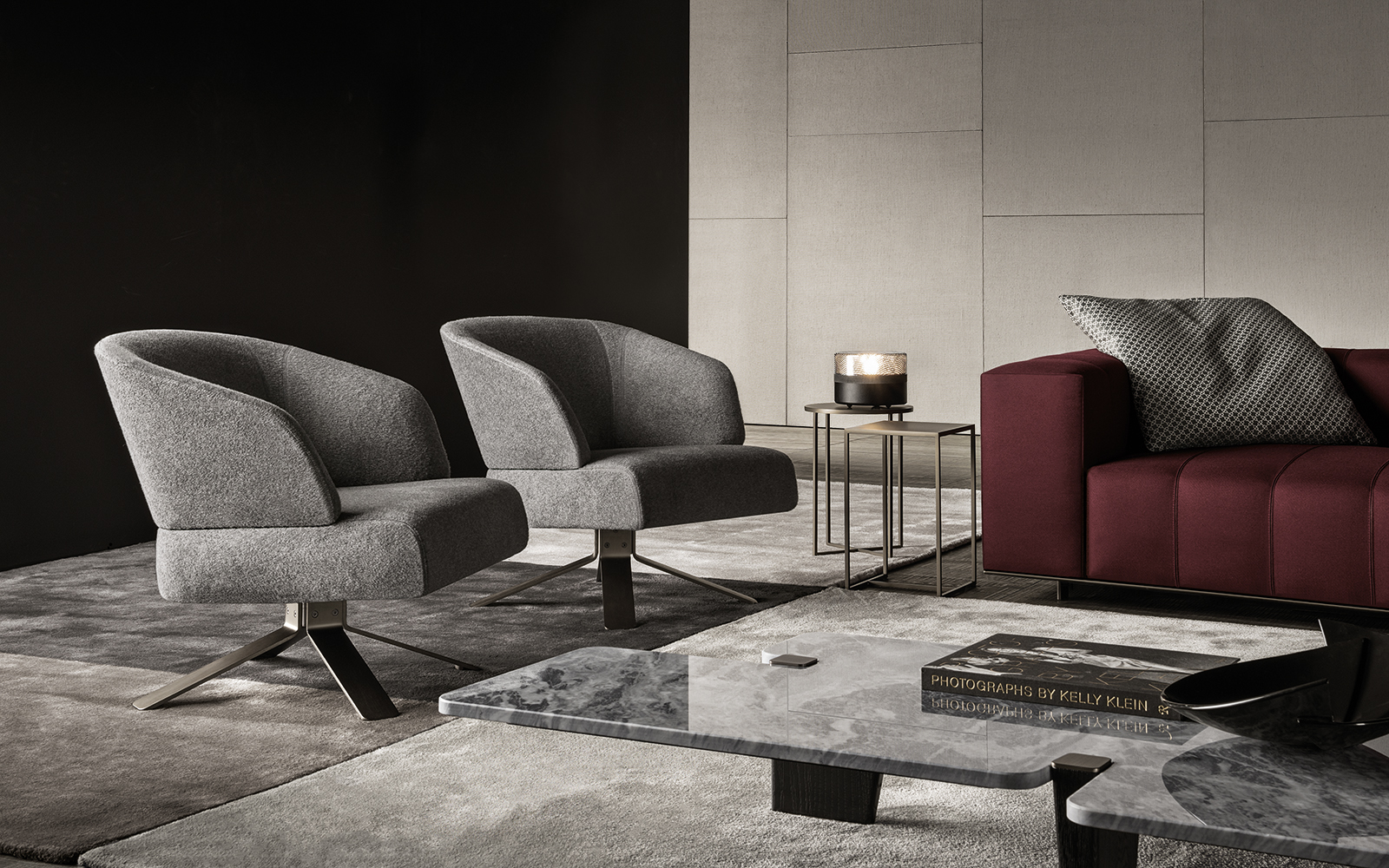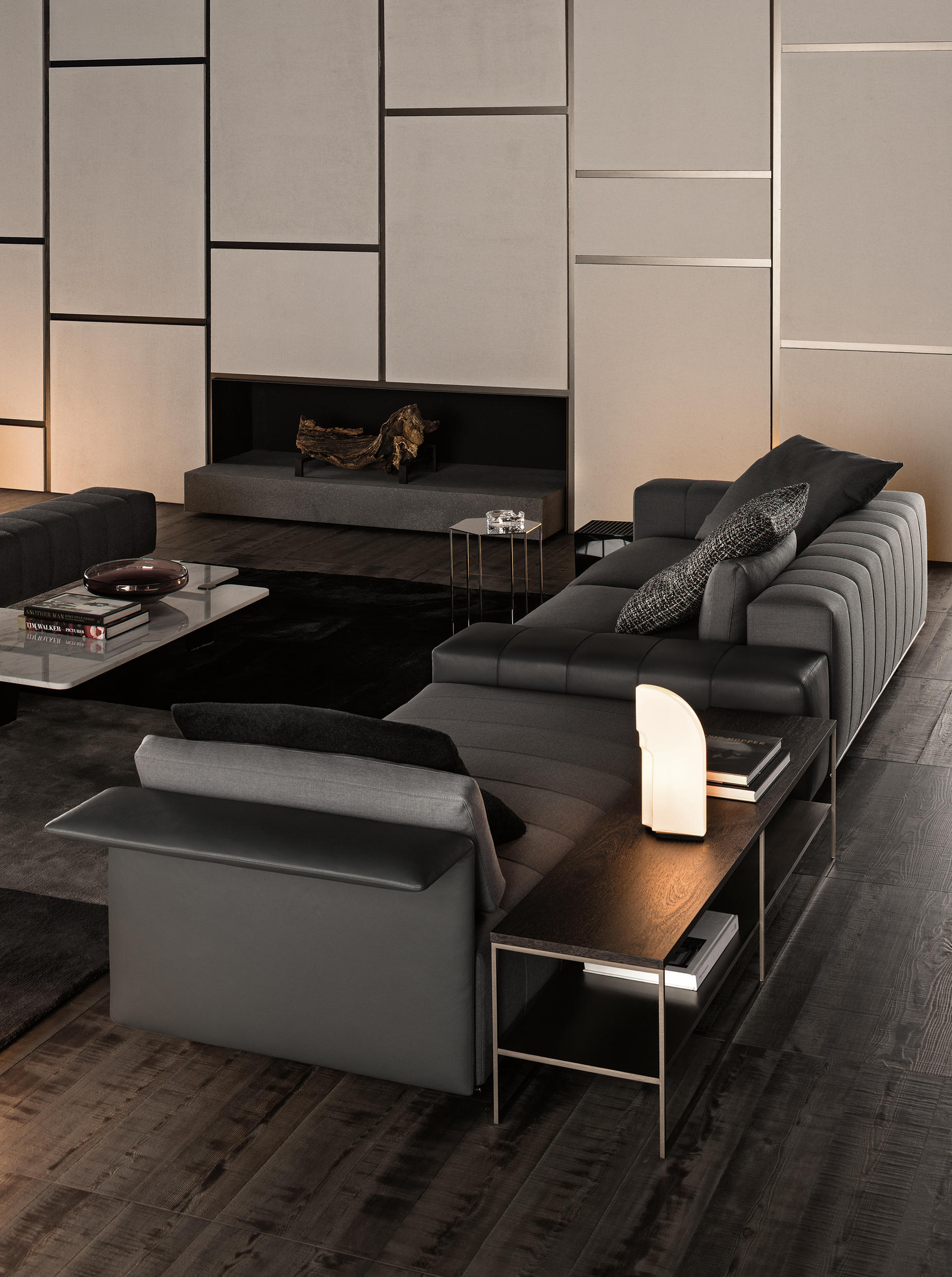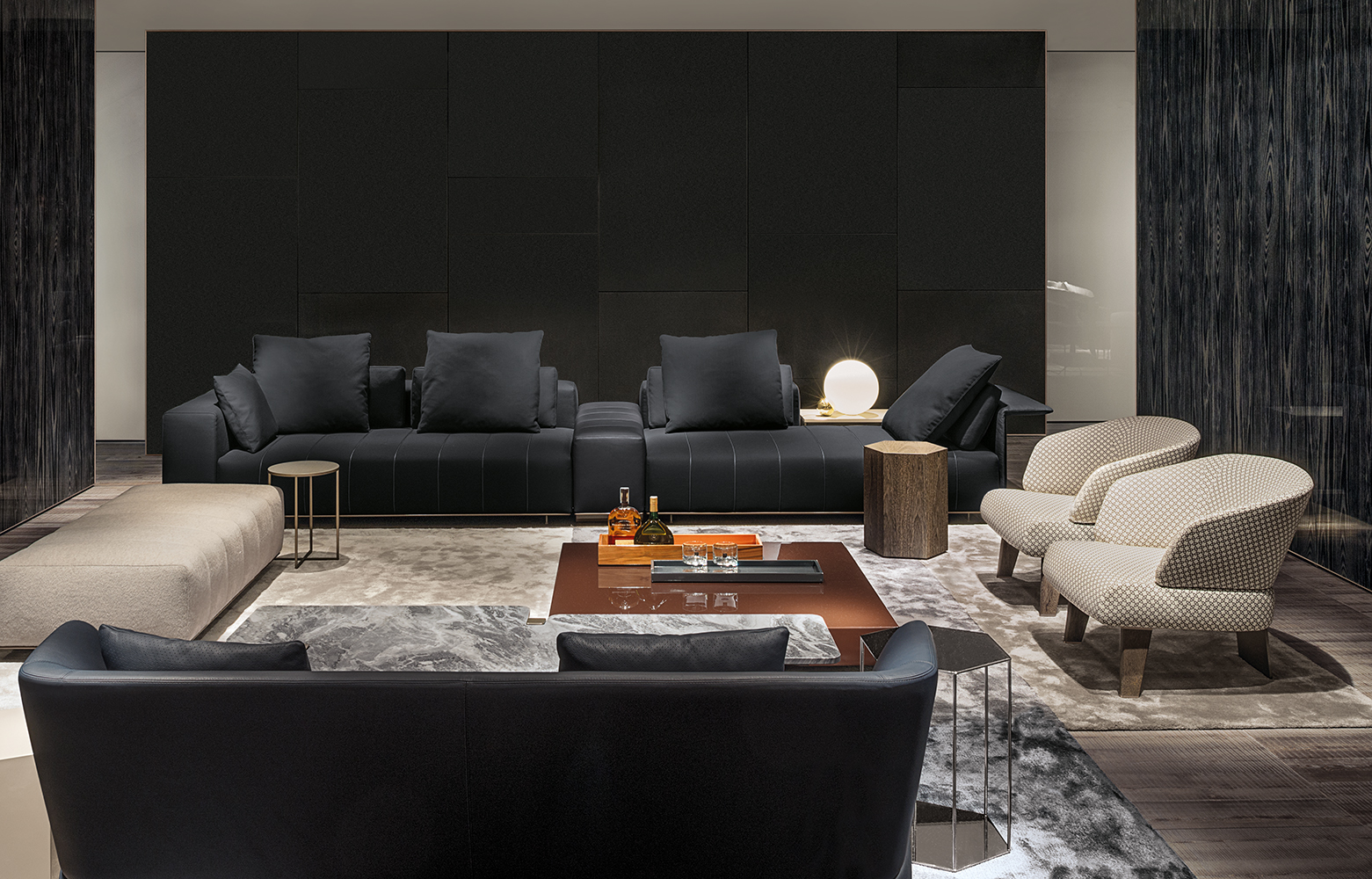 大理石是具有永恒魅力的材质,也为这组边几系列带来了优雅独特的灵感,产品摆放位置灵活多样,饰面种类繁多,此外还有多种造型和尺寸可供选择。桌面造型别具一格,支撑腿为黑色漆面的实心拉丝橡木。地面支撑的末端以及支撑腿顶端的部件采用铜色金属材质,这一细节设计为这款个性十足的产品平添一份精致的优雅感。饰面有不同材质可供选择:从米灰色的鲍迪豆木饰贴面,到精致考究的Calacatta或Bardiglio Nuvolato大理石台面,还有极具现代感的Sand色和灰褐色的亮光漆面。圆形桌面的边几样式不仅有米灰色的鲍迪豆木饰贴面,还有蓝绿色、花岗石色和Sand色的彩绘玻璃饰面。除了边几以外,Jacob家族的成员还包括一款写字台,其桌面样式有Sand色和灰褐色的亮漆饰面,还有米灰色的鲍迪豆木饰贴面。写字台还配有哑光黑漆的木制抽屉。