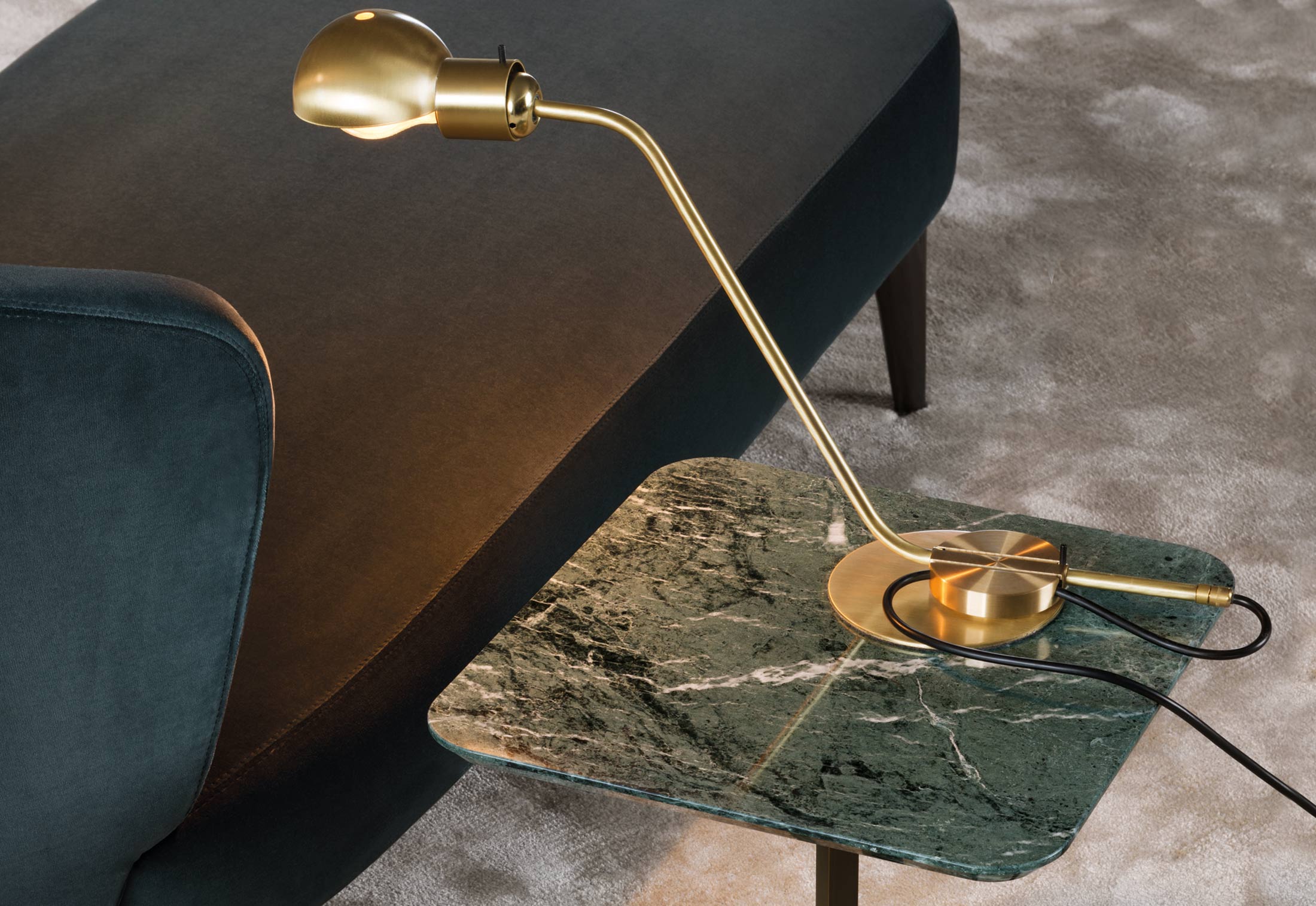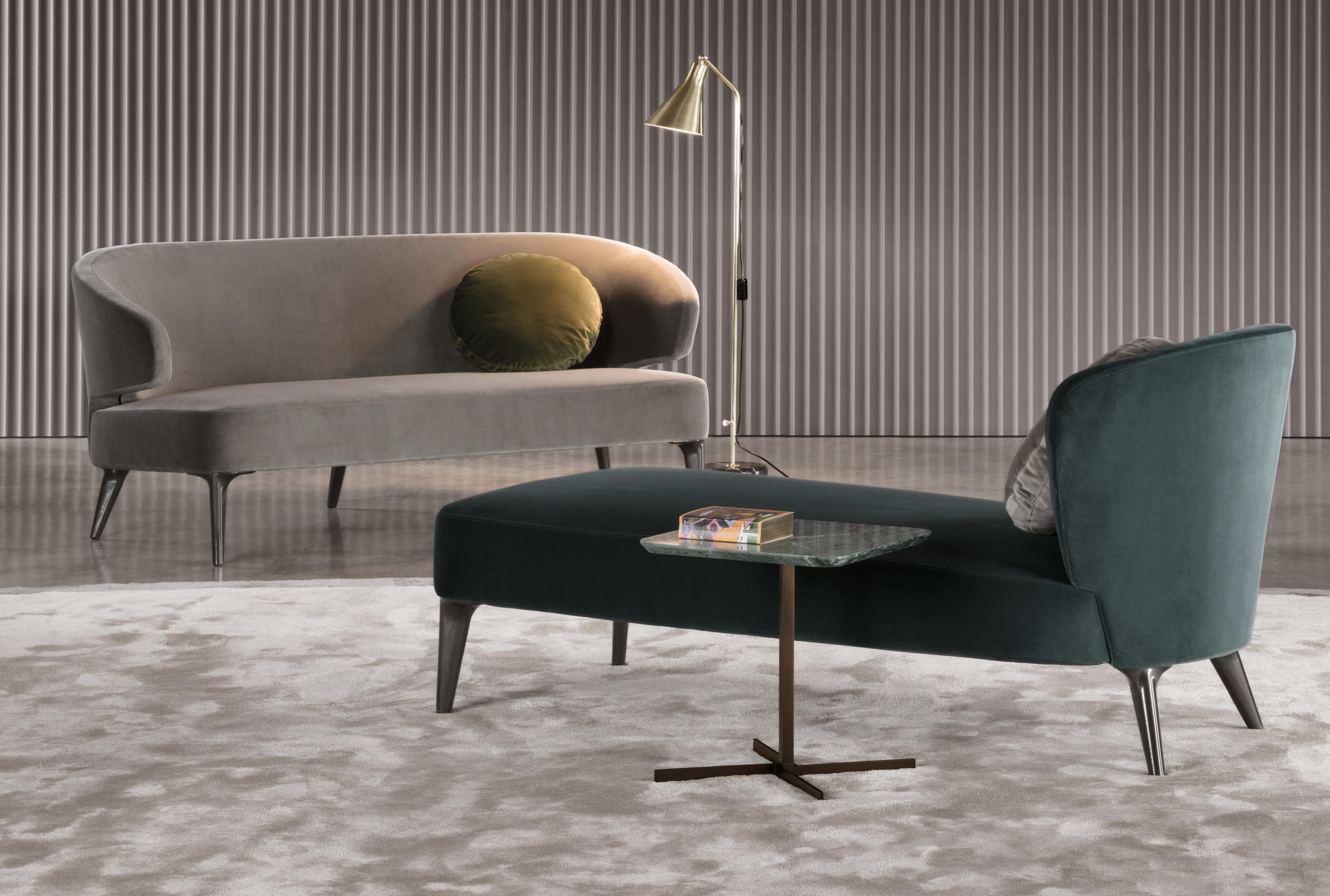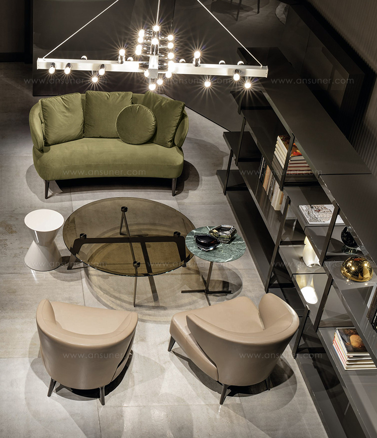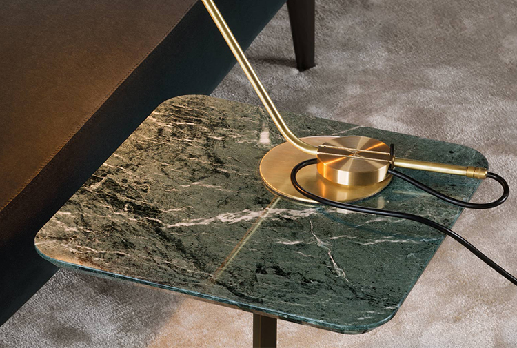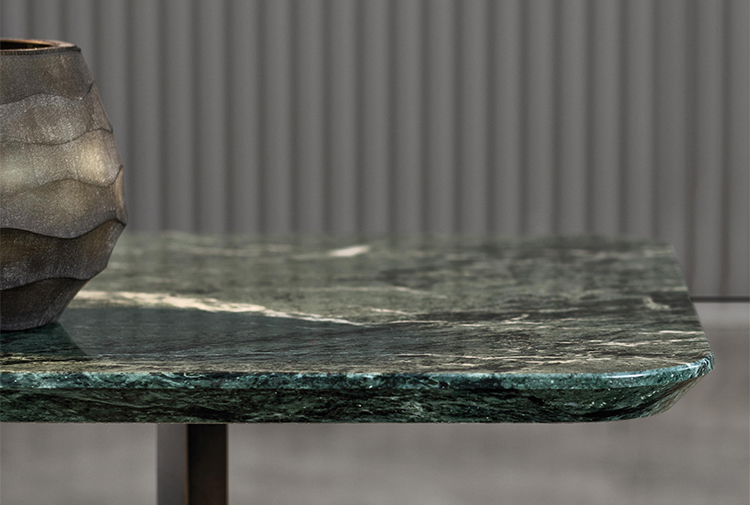 这一系列的产品用简洁的造型来搭配珍贵的材质,比如带有绿色调的Issogne大理石,台面采用斜切边缘的设计。地面支撑为金属材质,漆面为铜色,采用十字造型。Joy是一款可以搭配新系列中所有沙发座椅的边几,就造型而言,有高度为55厘米的圆形和高度为41厘米的正方形可供选择。