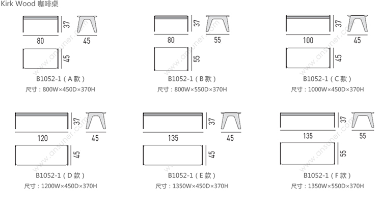 Kirk Wood 咖啡桌 系列尺寸/示意图