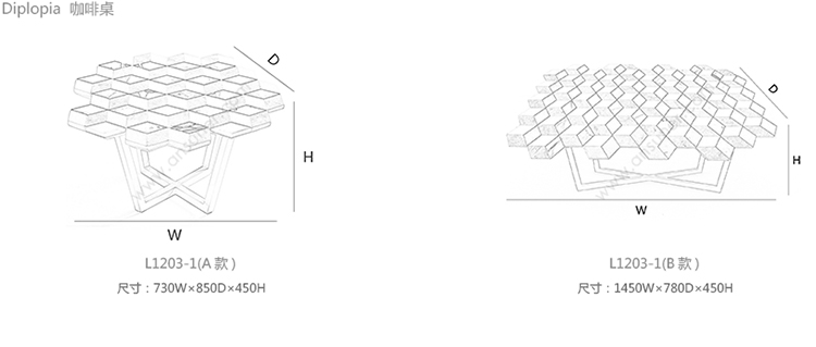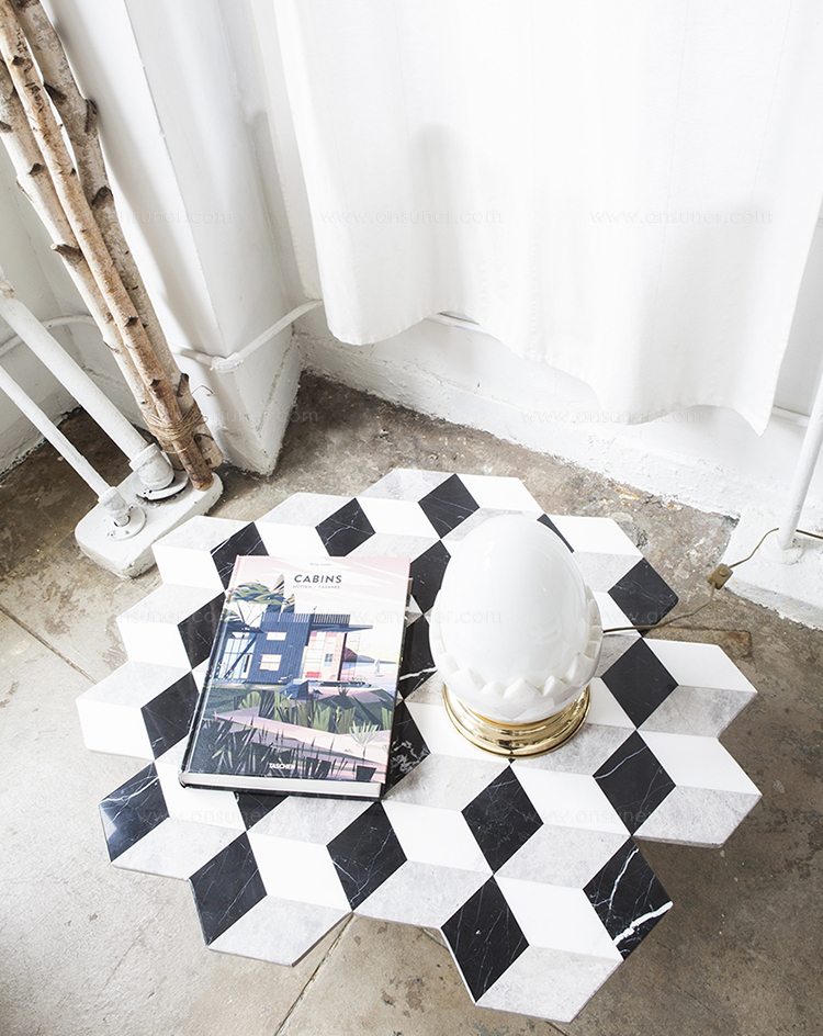 复视咖啡桌(Diplopia coffee table)是从创建一个传达视觉错觉的物体的想法中构思出来的。通过组合不同种类的大理岩产生立体效应。大理石桌面的不对称形式增加了复视的幻觉。复色的单色和彩色版本是用抛光或未抛光的铜腿制成的。更大的尺寸可根据要求提供。