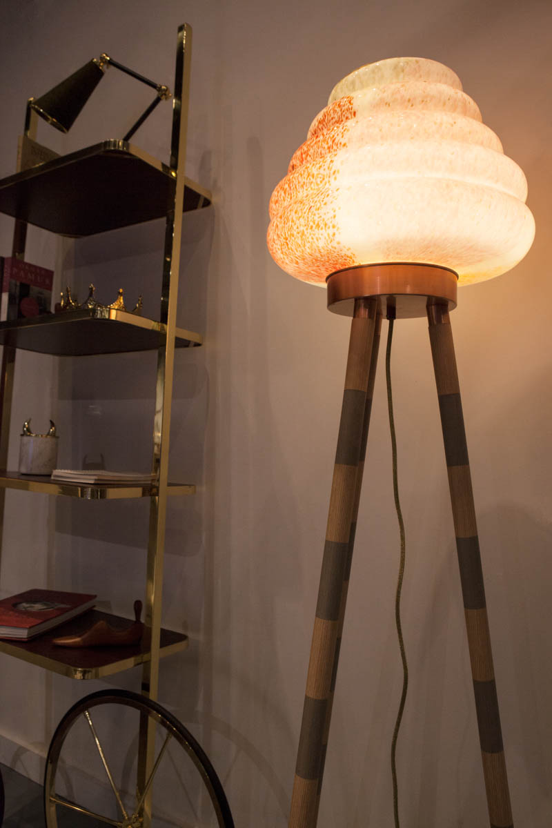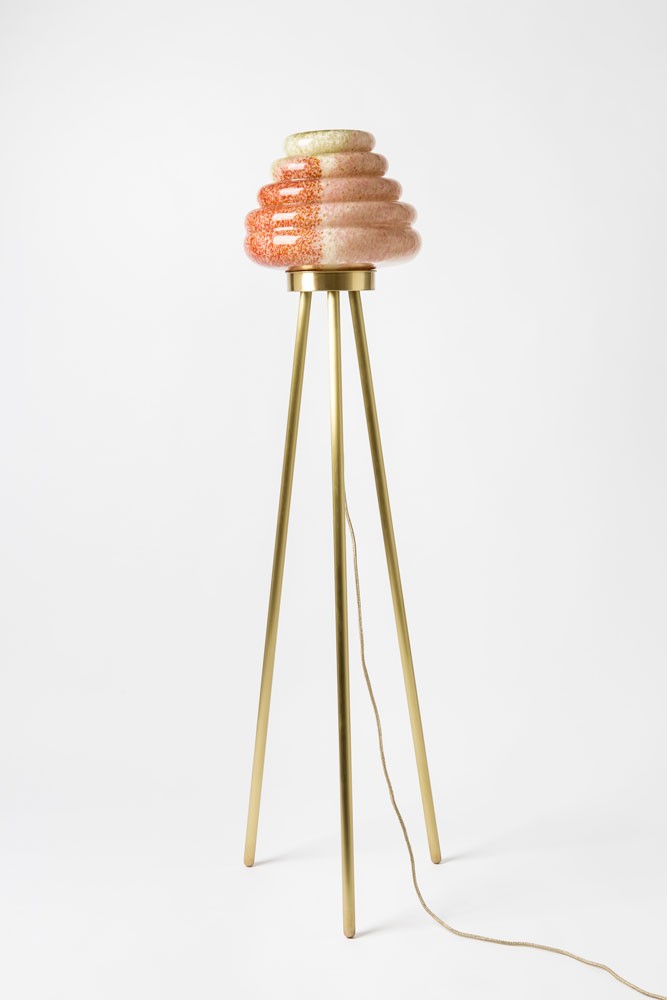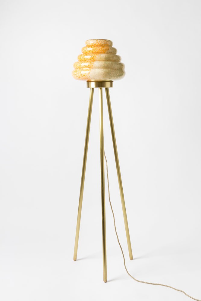 这款蜂巢式落地灯包括混合彩色手工吹制玻璃灯罩以及木质贴面腿和铜的不同组合。 第二个版本的Colmena有点缀图案的玻璃罩和哑光黄铜腿。 灯可通过调光器调节。 每件作品都是独一无二的,并定制。