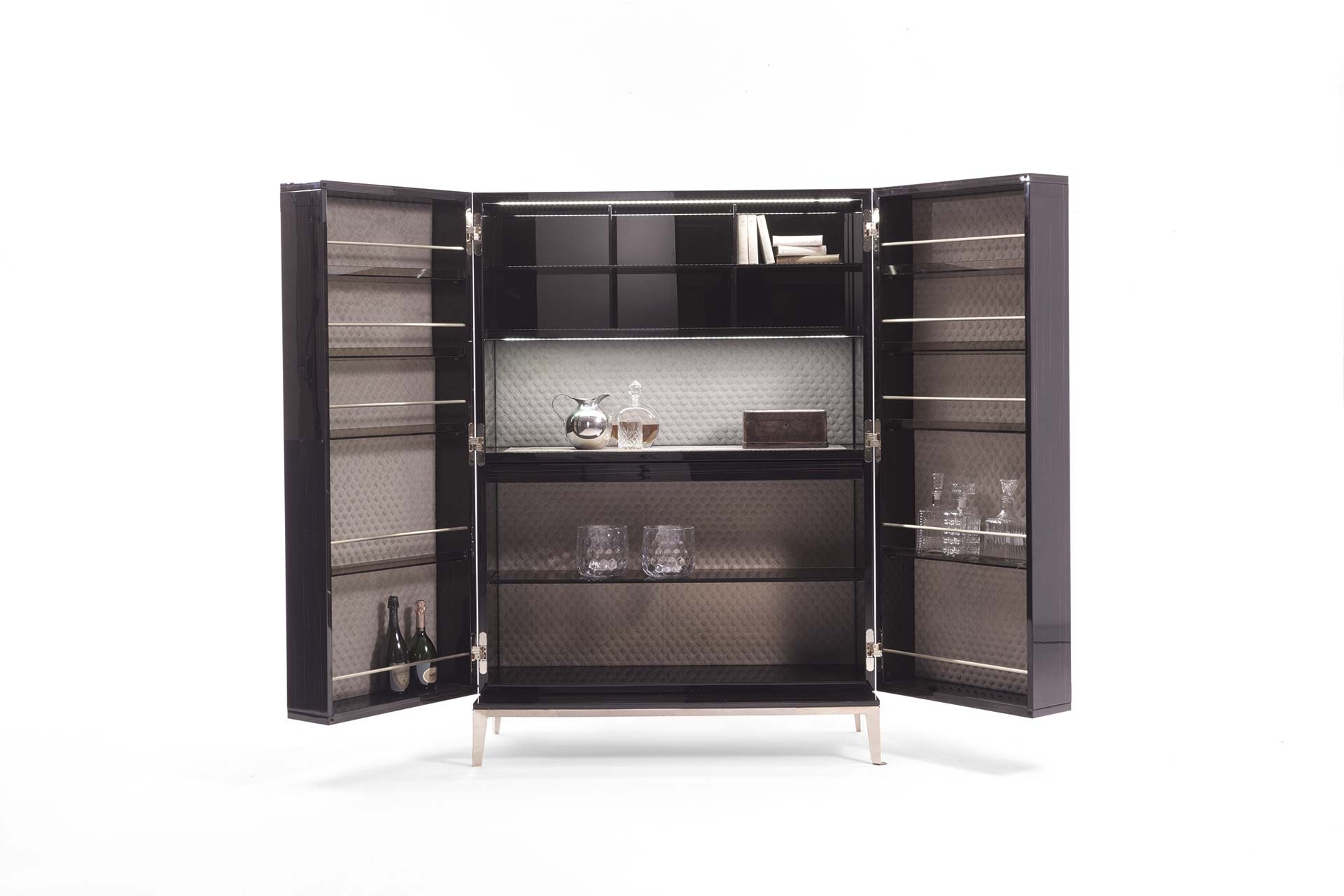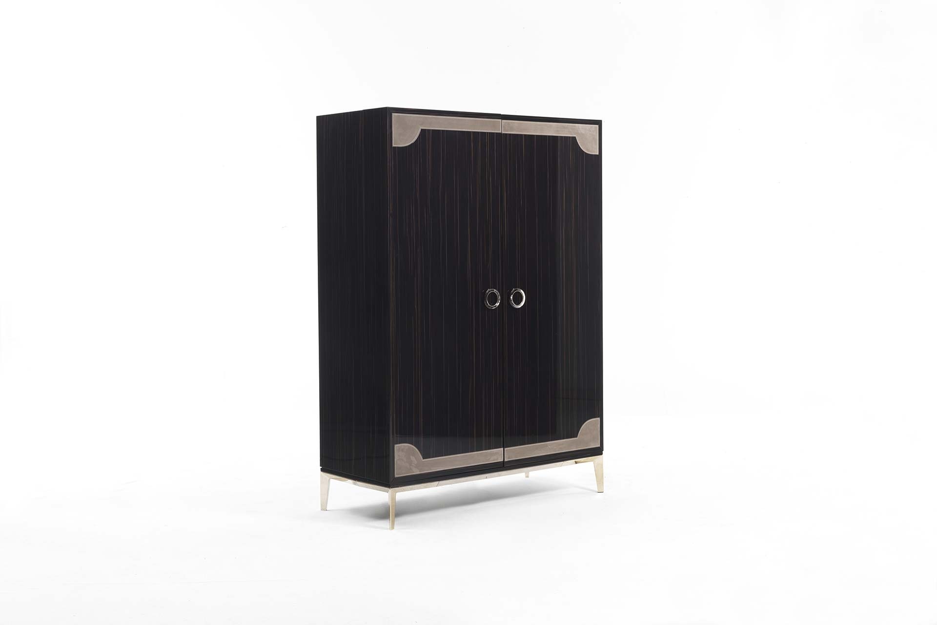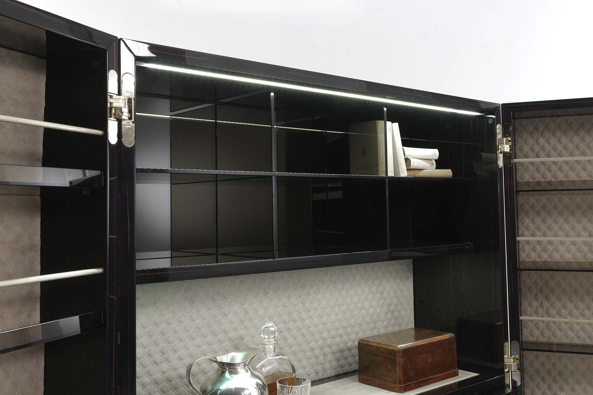 客厅集合项目的特点是精致的牛皮插入,几乎嵌在乌木