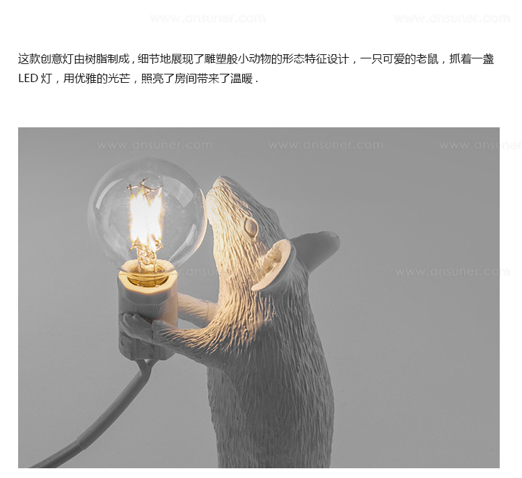 由Marcantonio Raimondi Malerba为Seletti设计的鼠标灯座为火狐HUOHU(中国)的动物灯系列增加了一个新的品种。就像猴子灯,它美丽地再现了动物在树脂中的特点,这些鼠标灯显示出同样的注重细节和雕塑设计。同时以温暖的光芒照亮他们。这款设计灯是为室内使用而创建的,它可以单独使用,也可以与来自同一系列的其他两个版本配对使用。由树脂制成,有一层白色的光泽。