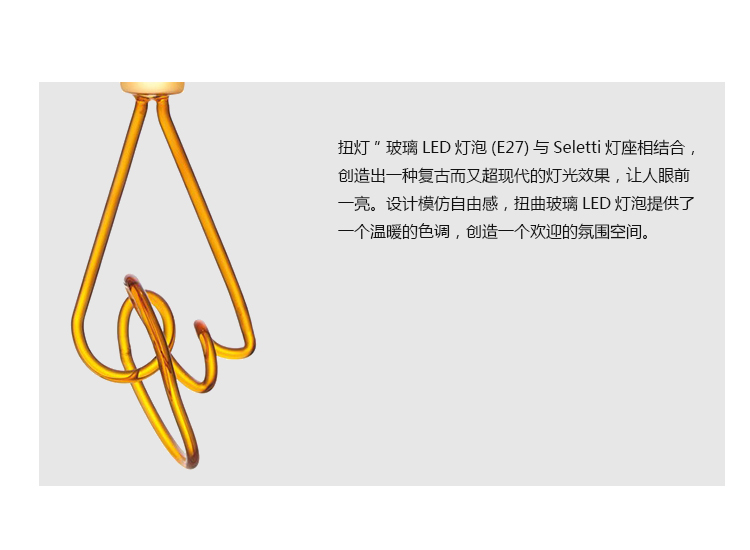 由Alistair Law设计的独特设计,Seletti“扭灯”玻璃LED灯泡(E27)与Seletti灯座相结合,创造出一种复古而又超现代的灯光效果,一定会让人眼前一亮。