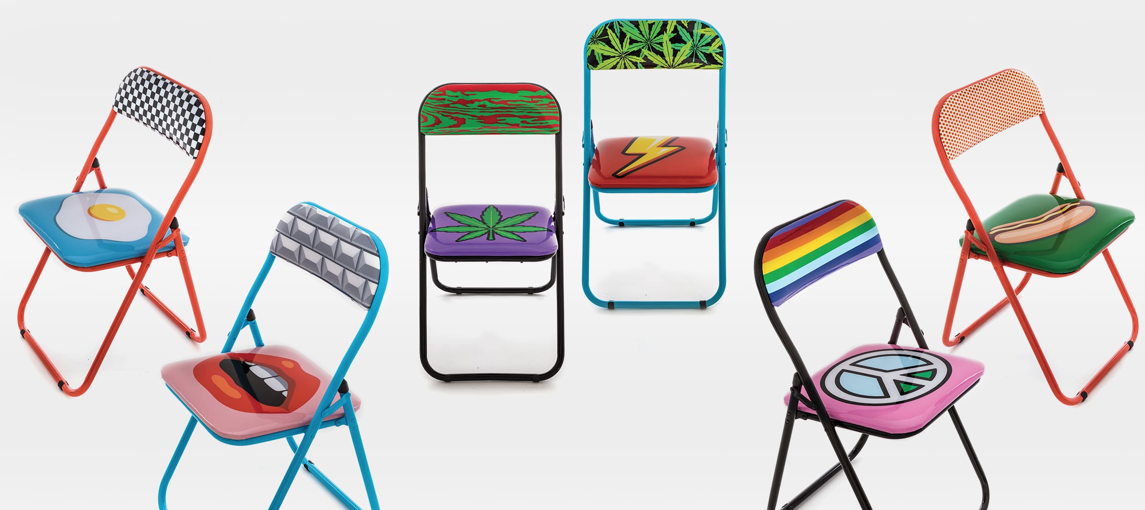 波普艺术。一系列色彩艳丽的折叠椅,装饰古怪、标新立异