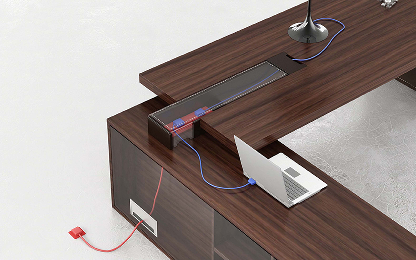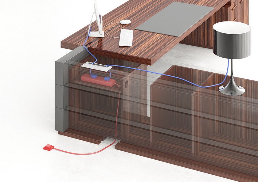 | · 班台分内外侧隐蔽式走线通过副台底板和侧板进线口连接地插,实现进线完全隐藏,台面电器可直接打开台面走线盖连接电源,实用方便、灵活, 电源连接配件可根据个人爱好任意选择 |