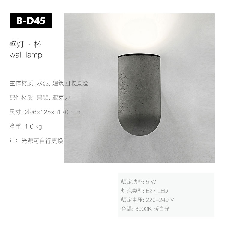“柸”曾获2014年度中国制造之美大奖,从理念到材料,从配件到功耗,我们尽可能极致。 扯一团光,塞进杯里,安在墙上。 杯间溢彩,杯底流光,用柸中一团光,点亮一扇墙的沉闷。 日常在细微处美着,火狐HUOHU(中国)用敏锐的洞察力,赋予它混凝土的工业气息。 一体出模造就了柸的细腻肌理,水泥特有的孔洞质感使它平添一股自然美感。金属色块稳稳地衔接着杯状水泥灯身与墙面。