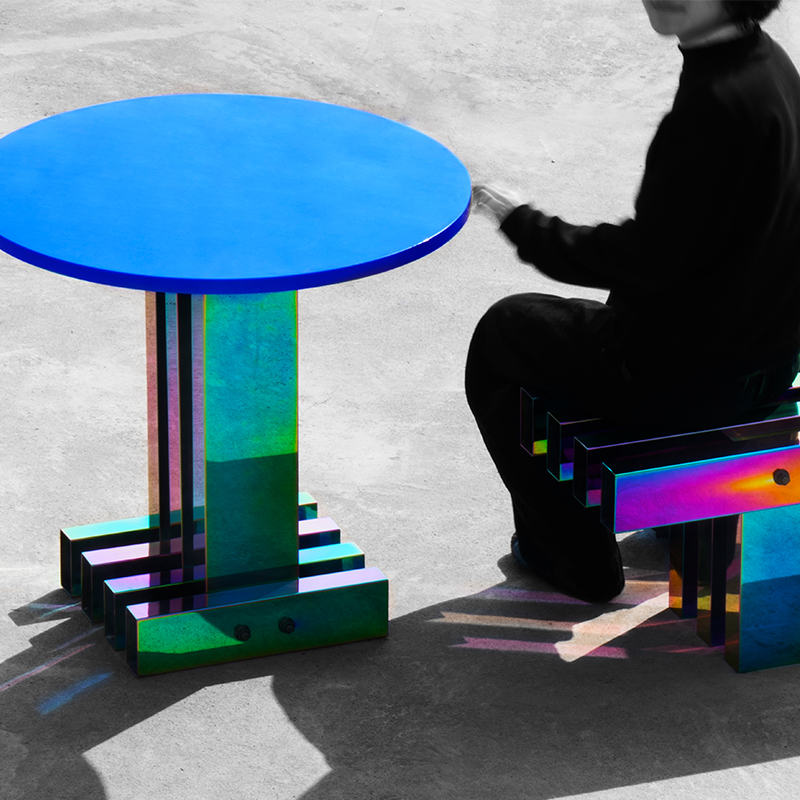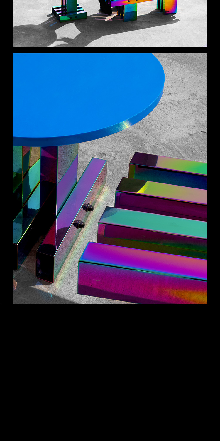 横竖横竖重复的组合方式,是来自草根的语言。常见工地搭台、围板,木方条拼组的,只需一次性的耐用而形成粗暴又稳固的结构方式。 极其炫丽浮夸的幻彩与粗鲁蛮横的草根形式形成反差,产生迷幻、跳脱、超现实的戏剧感受,似乎欲望的幻相,真实得不切实际。