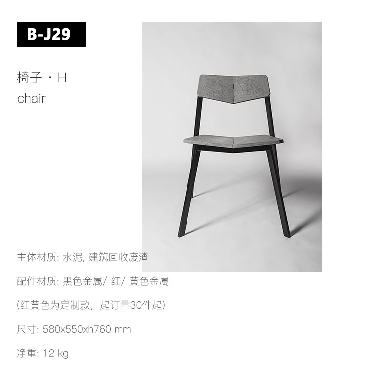 水泥部件采用超高强混凝土一体灌浆成型,无需再次打磨处理,让产品每个细节能保持高质感的同时,减少二次加工的经济成本浪费。在可持续性的探讨上,我们依旧坚持建筑废渣的再生利用。每160平米钢筋混凝土建筑垃圾,可以转化为4395张H椅子,当建筑废渣以符合社会需求的方式,进入产品生产周期中,由产品本身承担更多的社会责任。我们期待一种改变,改变不合理的资源消耗模式,改变设计以刺激消费为唯一主旨的商业主义倾向。