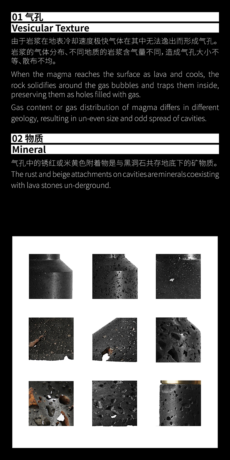 洞黑系列,洞悉秘密,来自地心的喷发。极想把洞石的芳华寂寞倾述出来,呈现于日常并使用它。尝试将洞石塑造各种形态,原材,呈浅灰色;亚光,颜色渐渐加黑;抛光,纯黑了。三种状态,魅力各异。深入践行,洞石的特性愈显,吸音、防水、防火、保温、隔热,耐酸碱、耐腐蚀、耐沾污、耐霉变,且无污染,无放射性。惊喜不断,质量很轻的洞石,居然强度很高,轻、硬,可塑性强,气孔式的通透,赋予了极简中的奢华。触目的拙,爱不释手。