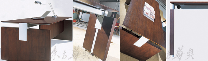 ※ 相互重叠的板面组合与因应几何结构摆设的CG-BEX008-D02系列,最能配合讲究设计的时尚办公室环境-各个独立板面采用悬浮形式组合,令实木用料感觉灵活轻盈;设计修长的主桌与两件侧脚板相连,客户亦可因应需求加置侧柜构成L型工作桌,半悬式实芯桌前挡板配搭银色聚氨酯盖面连接板,此款班台加添精巧美感。