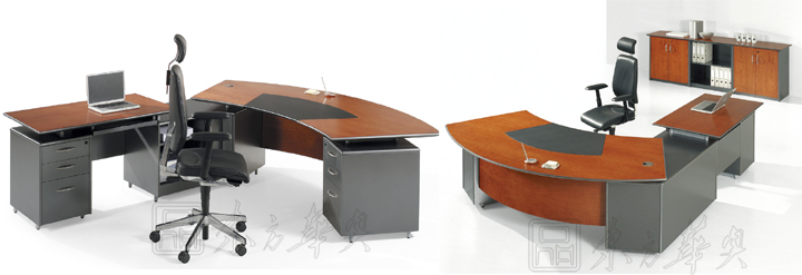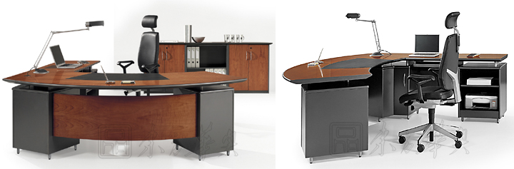 ※ 上图为CG-BEX015-D02款班台,新颖别致的扇形超薄台面、木纹与碳灰色仿皮漆的完美结合,令传统的办公桌不失现代气息。多功能的侧桌,内设现代办公设备放置空间,连接桌面圆形线槽,提高工作效率之余,更添时代科技色彩。