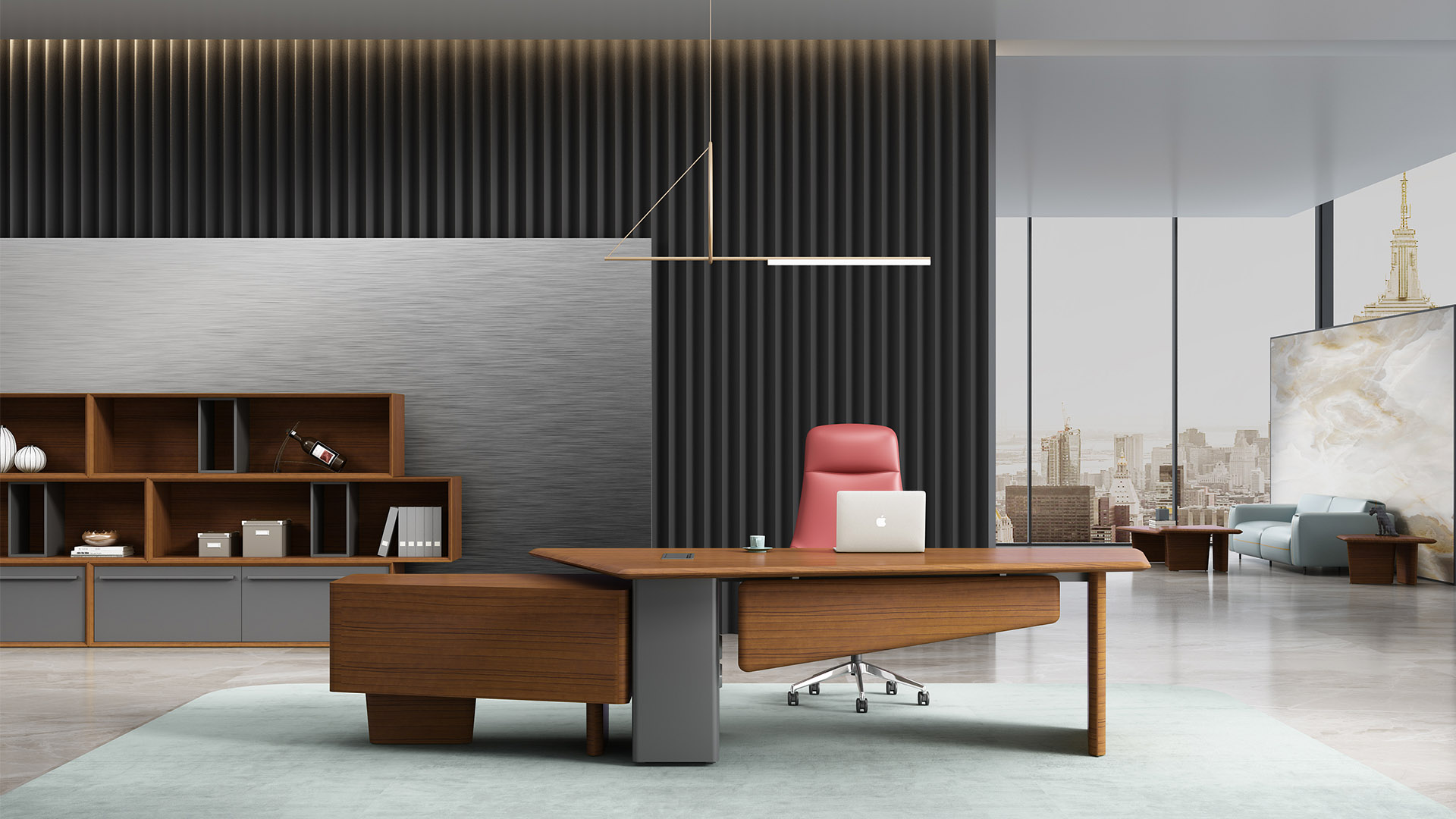 独特的台面造型,更好的兼顾了接洽的功能,是台面的功能 进一步延伸,给来访者提供更多的位置与空间。倾斜的侧柜 也让使用者有更大的活动空间,带来更广阔的视野。