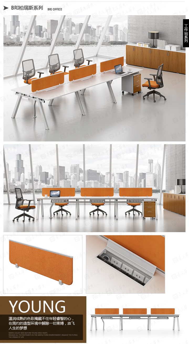 现代办公追求新的工作模式,开放式简约型的办公空间是年轻一代的追求,其中色彩扮演着很重要的角色,靓丽的色彩更能调动气氛。东方华奥潜心研究开发和主导整体的现代简约办公火狐官方网站。柏瑞斯系列,在设计上承袭简约主义的精神内涵,以简练的线面构成营造一个单纯与干净的办公生活环境,表现出独特的纯净与凝练,营造出一个设计韵味机枪的办公环境。同时,柏瑞斯以温暖的阳光色调为主要基调,橙色宣扬一种阳光活力的精神,活泼、迷人中带有一点点现代与浪漫的碰撞后产生的时