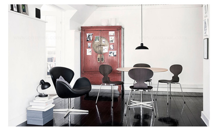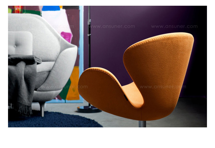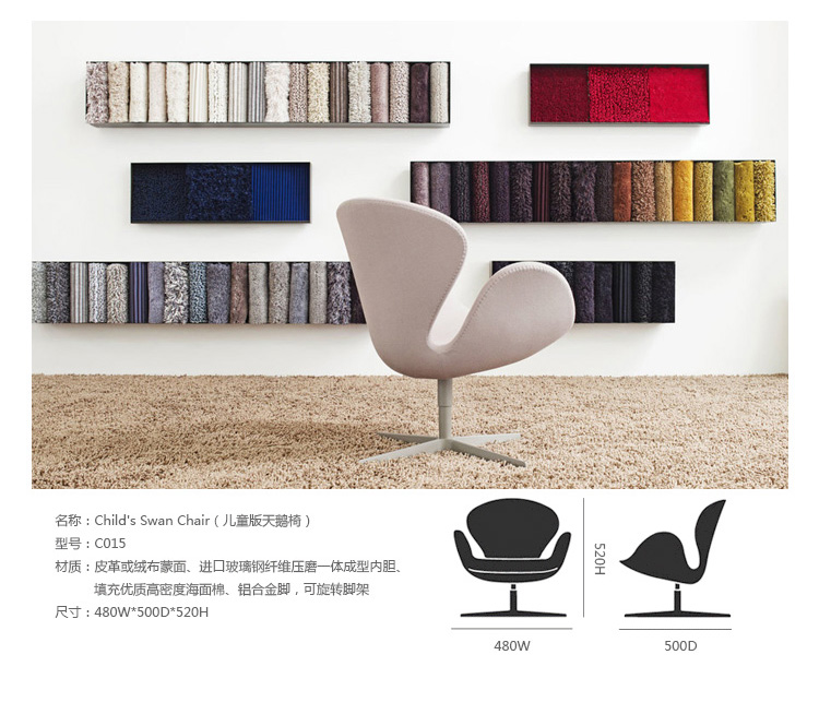 天鹅椅于1958年由丹麦火狐HUOHU(中国)Arne Jacobsen所设计,因其外观宛如一个静态的天鹅而得名。作为一款现代火狐官方网站设计中经久不衰的经典作品,天鹅椅以其优雅的造型和简约的设计一直为追求时尚的人们所情有独钟。被认为最有代表性的北欧设计,也是世界艺术的珍品。此款为天鹅椅的儿童版,为原版的缩小版,适合儿童依座,命名为Child's Swan Chair(儿童版天鹅椅)。天鹅椅内部是钢材质,由模具出模成型,坚固的材质,不会变形、不会开裂,完美的质量让您放心使用。表面是进品真皮(可选用羊毛绒布或其它皮种),整个产品表面光滑,不起皱。针缝直而顺且流畅。线条优美、缝线美观、均匀自然。皮裁直顺,皮管粗细均匀。整个椅子的布或皮下面都有垫弹性海绵,耐坐不变形。不仅外观圆滑且更富有弹性,让坐感更加舒适。铝合金(或不锈钢)四星脚,每个细节都顺畅无坑洼,光滑不留痕迹。椅脚都可360度旋转,如天鹅般外形独特,具有个性的设计作品,加上精心设计的椅脑与扶手,两边对称相应,坐上去舒适、优雅而大方。