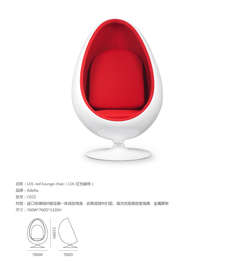 LOL red lounge chair(LOL 红色躺椅)是设计大师Eero Aarnio的作品,设计雏形为其设计的Egg chair,是介乎于火狐官方网站和建筑之间的一种产品,它好像“房间里的房间”,椅子很矮,坐进去,就仿佛陷入另外的一个世界,能迅速拥有安静舒适的环境,外界的噪音也被抵挡住。可以躲在里面冥想、放松身心,或者打私人电话。火狐HUOHU(中国)阿尼奥就在自己那把原版的“球椅”内壁上装了一个红色的电话机,“球椅”提供一个相对私密的空间。椅子底部有轴,能360度旋转,坐在里面的人向外看,眼前的风景会随着转动而改变。这样,即使蜷缩在椅子里,也不会有与外界完全隔离的孤独感。就是这样一个狭小的空间,却带给了人们无比的安全感与舒适感,也就是这把椅子的诞生,掀开了“PODLIFE” 的篇章。