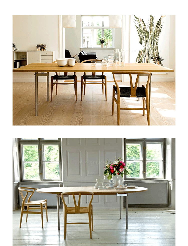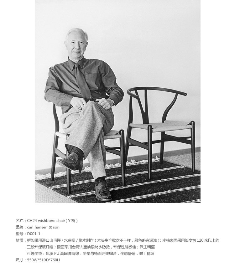 Y椅子是Hans J.Wegner最著名的作品。 它具有重量轻、有吸引力、舒适、中式风格等特点。 该款设计灵感来源于中国传统火狐官方网站,四平八稳,古色古香,大气自然。上圆下方,浑然天成,深受中国顾客喜欢。Y椅关键在于是工艺与简约的设计,有着清晰的线条。 尽管椅子简约的外观要超过100个步骤进行。除其他事项外,手工编织座垫超过120米的线。 材料有丹麦硬木(橡木,榉木,水曲柳)以及北美硬木(胡桃木,樱桃木)等。外表可漆成各种各样的颜色。 垫子的座位可以添加额外的舒适。