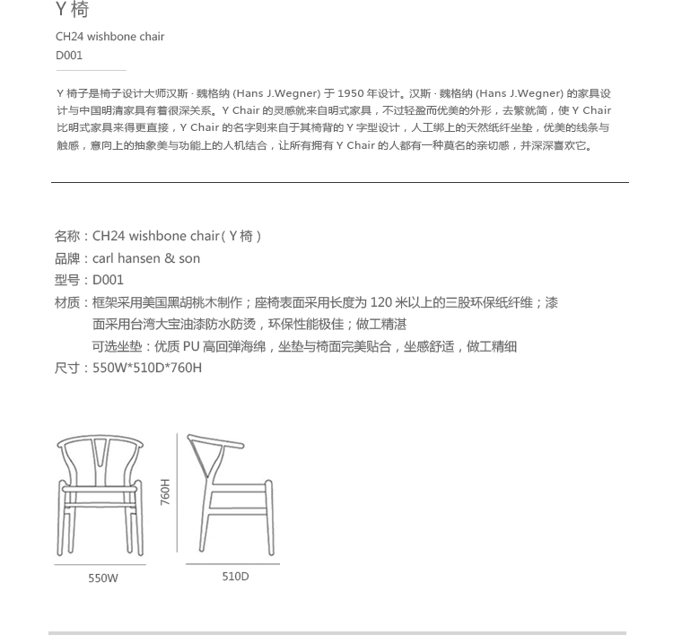 Y椅子是Hans J.Wegner最著名的作品。 它具有重量轻、有吸引力、舒适、中式风格等特点。 该款设计灵感来源于中国传统火狐官方网站,四平八稳,古色古香,大气自然。上圆下方,浑然天成,深受中国顾客喜欢。Y椅关键在于是工艺与简约的设计,有着清晰的线条。 尽管椅子简约的外观要超过100个步骤进行。除其他事项外,手工编织座垫超过120米的线。 材料有丹麦硬木(橡木,榉木,水曲柳)以及北美硬木(胡桃木,樱桃木)等。外表可漆成各种各样的颜色。 垫子的座位可以添加额外的舒适。