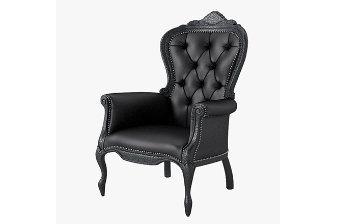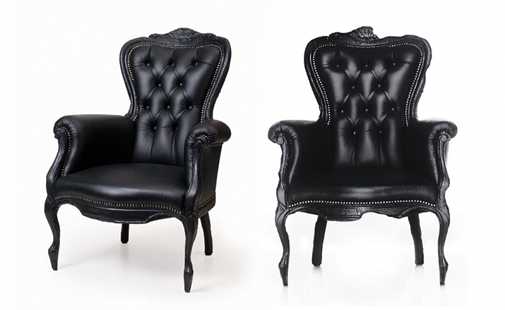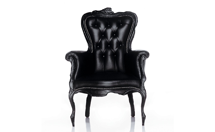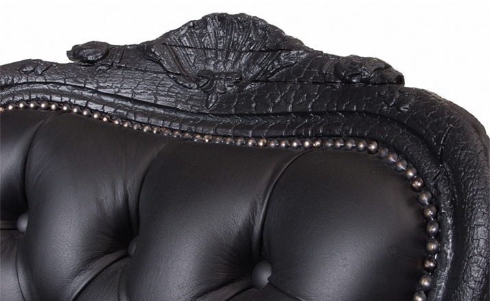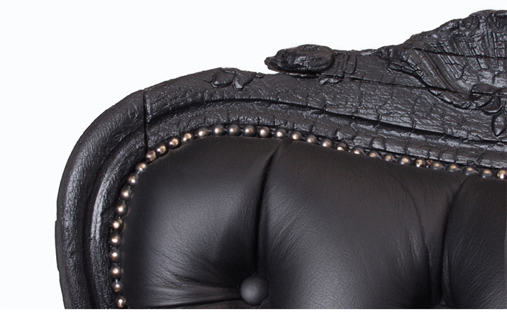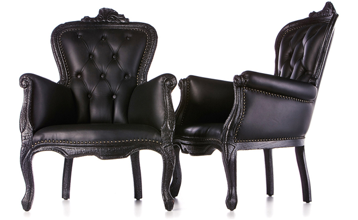 "Pieces of furniture are literally burned,after which they are preserved in a clear epoxy coating.The beauty and character of burned wood is now captured in a long lasting material, creating the strange sensation of sitting on burnt furniture.Maarten Baas is a Dutch designer who graduated from Design Academy Eindhoven in 1996.In 2000 he studied for several months at the Politecnico di Milano. In June 2002 he graduated at the Design Academy a series of burned furniture called "Smoke".Maarten is searching for the boundaries of design,without leaning on the regular"do's and don'ts".The Smoke series includes armchair,dining chair and chandelier. Each item from the Smoke series share the unfamiliar and untamed finish that is categorized by fire.Each piece is unique and may differ due to the process used for production.The smoke chair is upholstered in black leather and has a secret repair kit underneath the seat in case of emergencies."