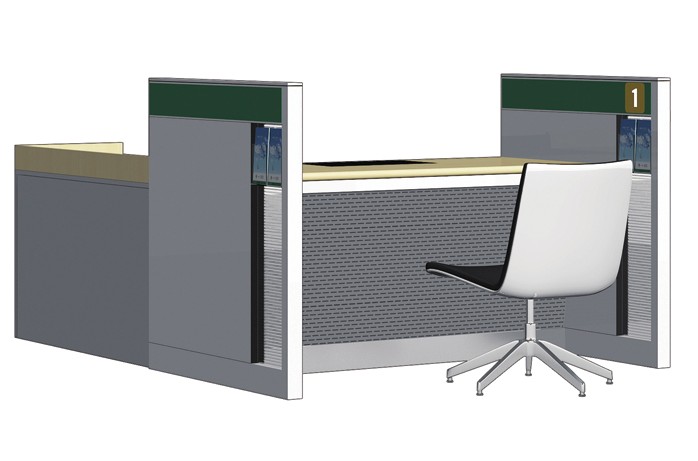 材质说明:柜台采用灰色烤漆钢冲压板,桌面白枫防火胶板,浅灰色定制侧柜横纹玻璃,拉丝不锈钢踢脚。