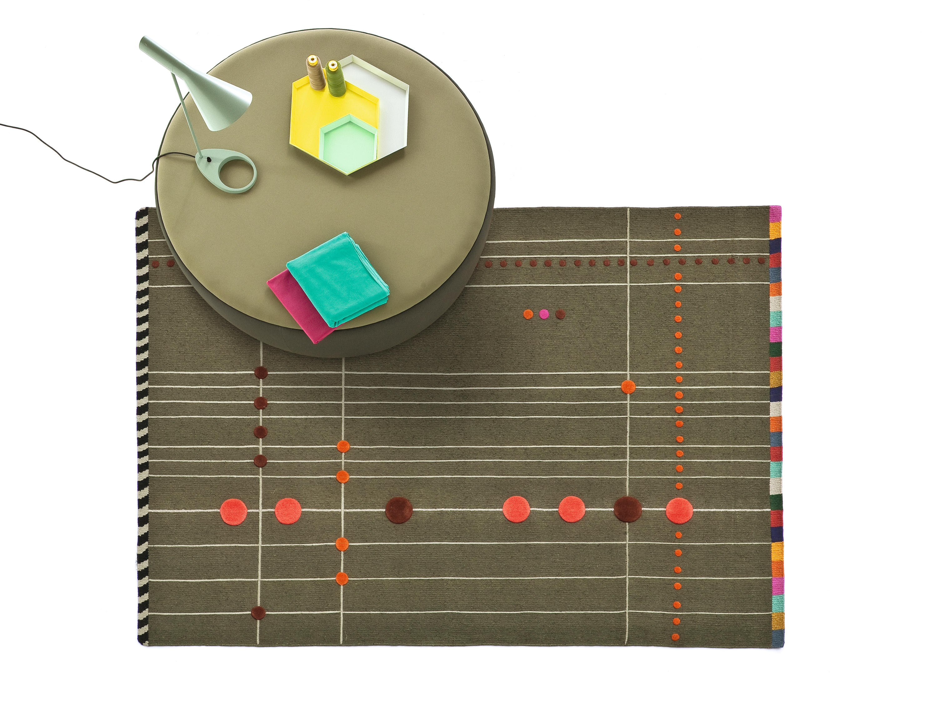 除了美丽的羊毛卷曲,Rabari有四个地毯(两个是米色的,一个是黑色的,一个是橄榄绿的),还有一个突出的设计,一幅Doshi Levien设计了一种精致的节奏和独特的视觉美感组合的画布。