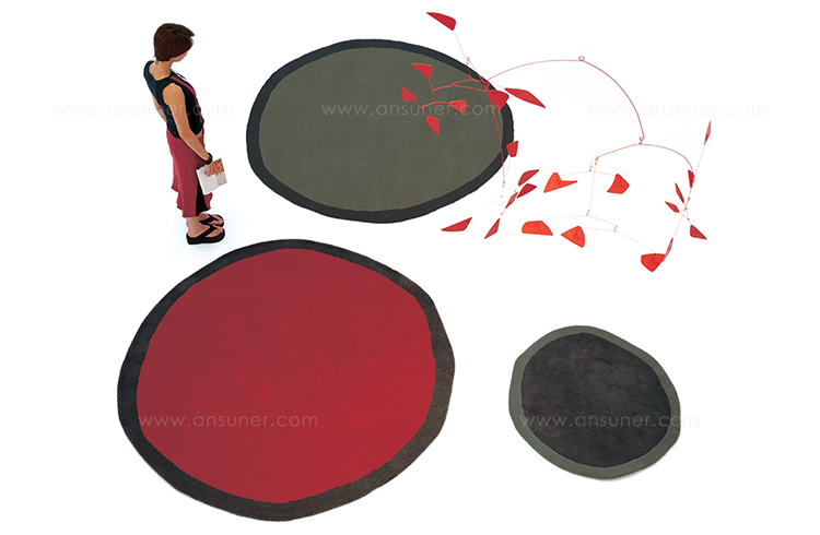 它由三种不同颜色的圆形模型和两种不同大小的圆形模型组成,一个正方形的版本,这是一个从来没有精确或对称的地毯。