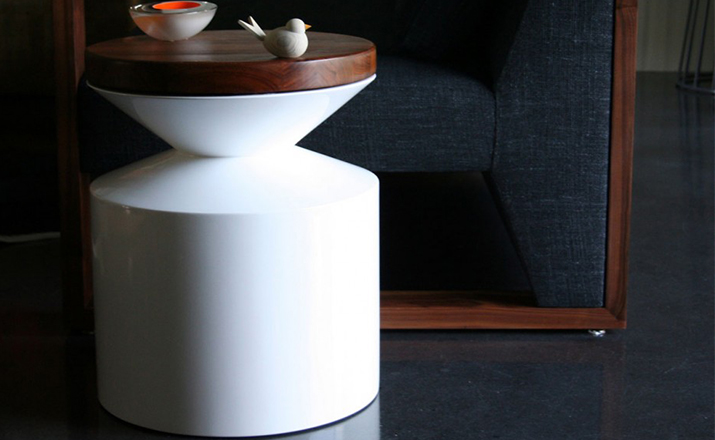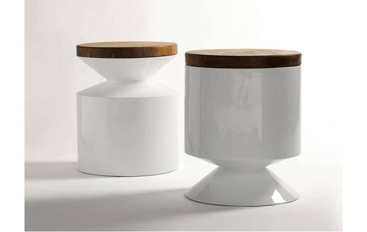 This versatile piece works interchangeably as a side table or stool.Made from a hand sanded fiberglass shell and finished with a high-end automotive polyurethane gloss finish,it is lightweight and durable.The 1.5 solid lumber top tempers the clean architectural form with its warm organic presence.The wooden lid can be sourced on either side at time of order. Indoor use only.