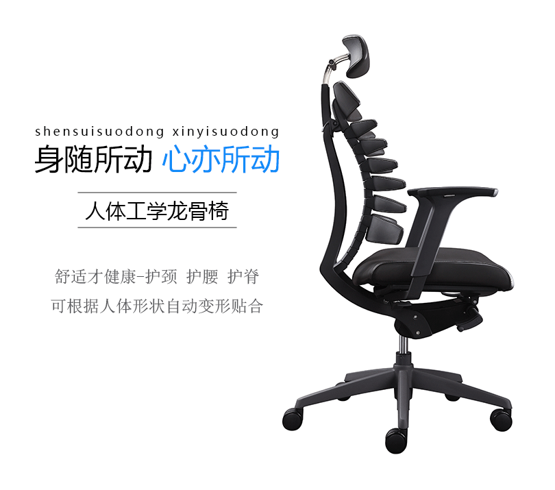 龙骨椅模拟人体脊椎骨造型及特点,并运用贴合返回技术,使座椅自动贴合背部。龙骨椅是一款符合人体工学的全功能性办公椅,力求使用者能充分理解其人性化的设计及达到最舒适的调节。