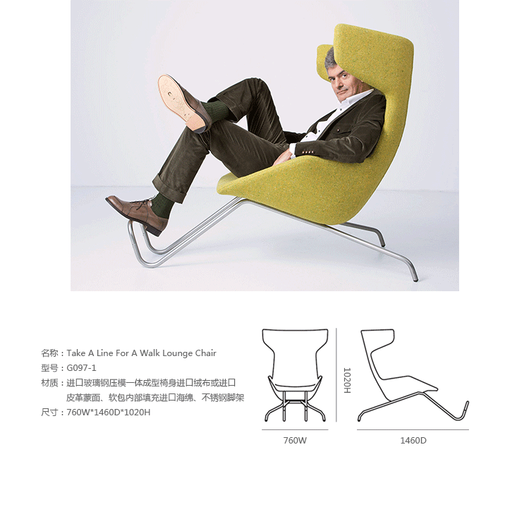 Walk Lounge Chair(行走椅)是由阿根廷著名火狐HUOHU(中国)Alfredo Haberli设计的,无论放置在客厅、还是卧室、更或者公共空间,都非常的合适,并凸显经典时尚的气息。椅身的面料可做羊毛绒或者意皮,多种颜色任君选择。 针线走得直、流畅,缝线美观、均匀自然,线条优美。四星固定铝脚/不锈钢脚,表面光亮,拐弯处顺畅,光滑不留痕迹。内置玻璃钢都是采用出模一次成型,精心设计的座位、靠背连成一体,椅子可以360度旋转。外形独特,结构简单。现代,时尚,美观而且耐用。坐上去舒适,优雅而大方。从而达到减轻压力,消除疲劳的效果。