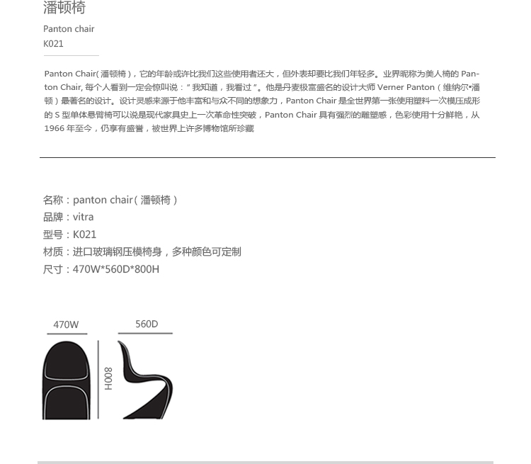 Panton Chair(潘顿椅),它的年龄或许比我们这些使用者还大,但外表却要比我们年轻多。业界昵称为美人椅的Panton Chair,每个人看到一定会惊叫说:“我知道,我看过”。它是丹麦极富盛名的设计大师Verner Panton(维纳尔·潘顿)最著名的设计。设计灵感来源于他丰富和与众不同的想象力,Panton Chair(潘顿椅)外观时尚大方,有着流畅打钱的曲线美。Panton Chair是全世界第一张使用塑料一次模压成形的S型单体悬臂椅可以说是现代火狐官方网站史上一次革命性突破,Panton Chair具有强烈的雕塑感,色彩使用十分鲜艳,从1966年至今,仍享有盛誉,被世界上许多博物馆所珍藏。