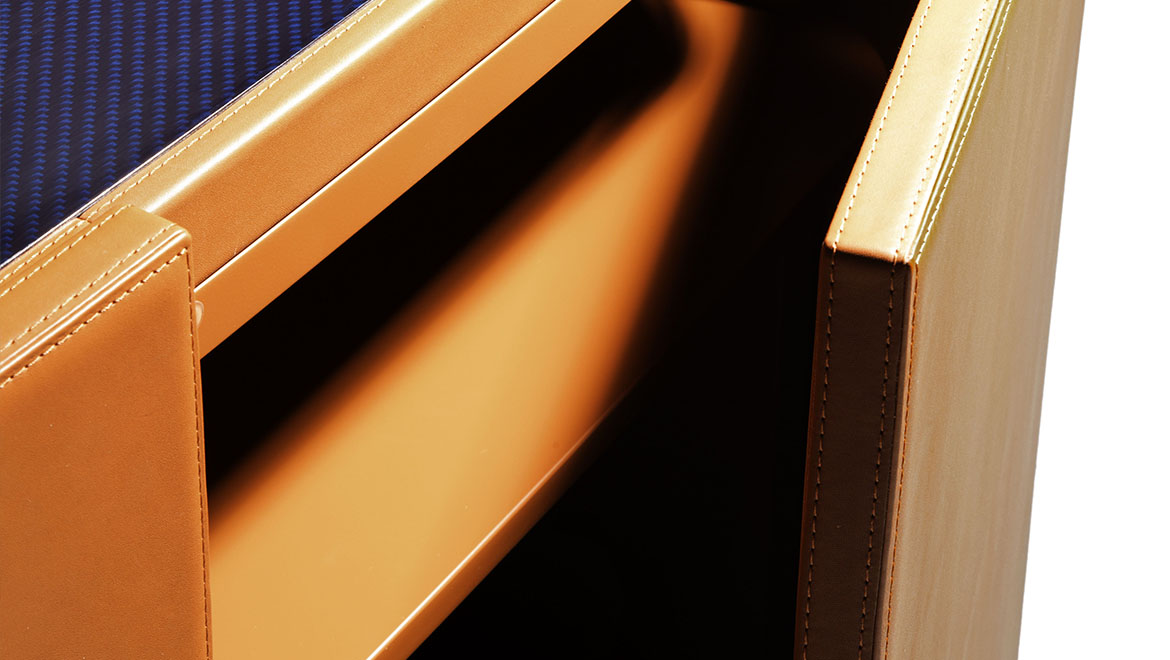 The leather top is coordinated with the new storage modules, in original versions with three and four doors and carbon fibre tops in the elegant Blue Royale finish. A functional complement with a compact design, equipped with many compartments, to be opened and closed by hand or by means of a magnetic locking badge. Wireless recharge stations complete the range of high-tech optionals for this model.
