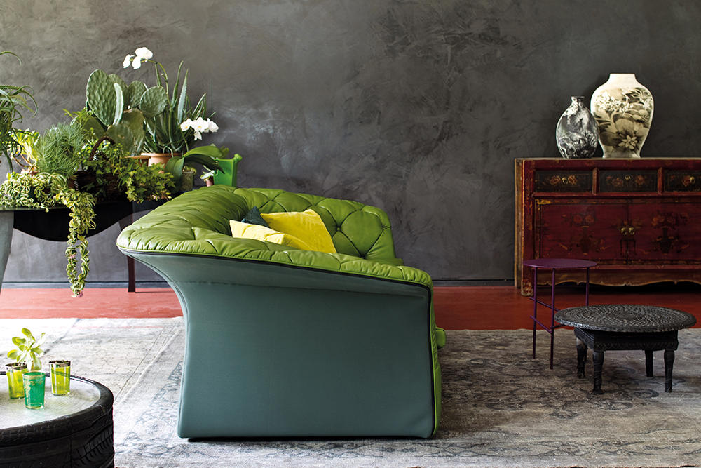 帕特丽夏·厄奎奥拉采用的是一种全新的旋转方式,革命性地改变了这一概念,她设计了一系列的产品,这些产品的形状看起来是液态的,就好像它们在框架上融化一样,以制造柔软的,舒适的,几乎随意的线条,这些布料和皮革都用按钉固定在外壳上。这些碎片似乎披着披在肩上的披巾,座椅上有各种重叠的软垫:几乎是对其覆盖层的设计、层叠的皮革和其他材料、颜色和面料类型的关注。这是一种奢侈的拼贴,当它穿过时,就会给人一种游牧式的全球精神。